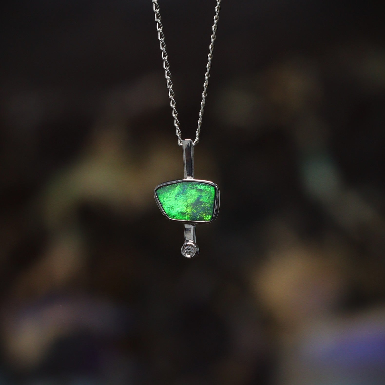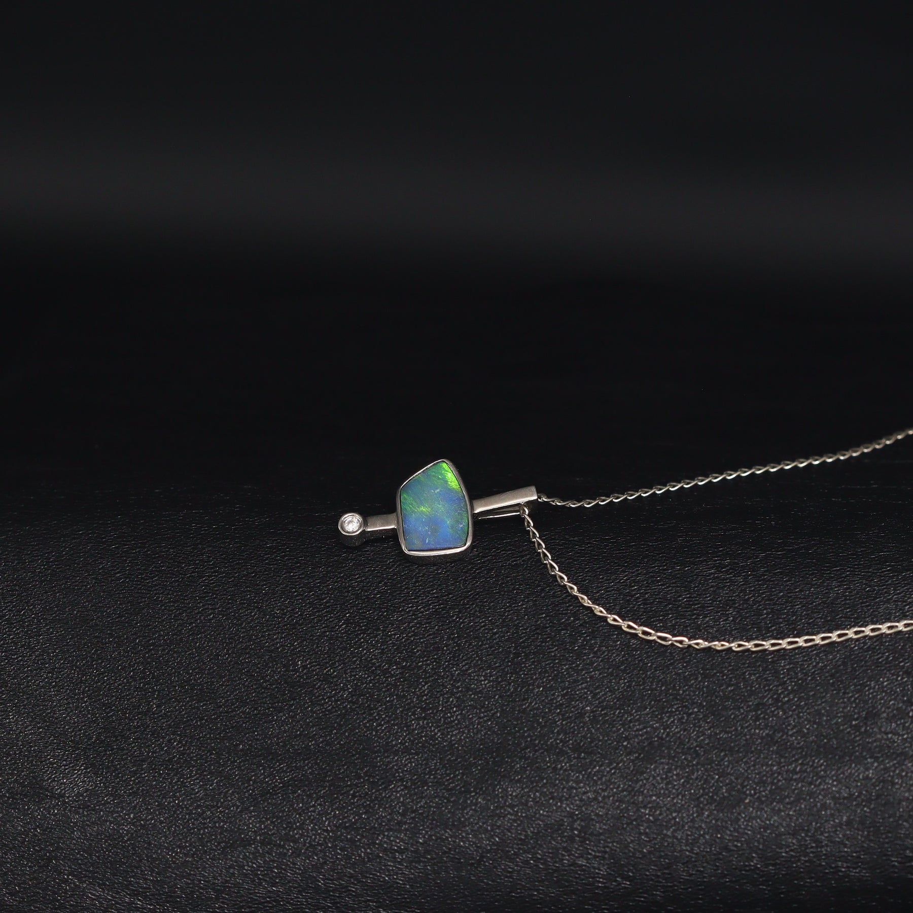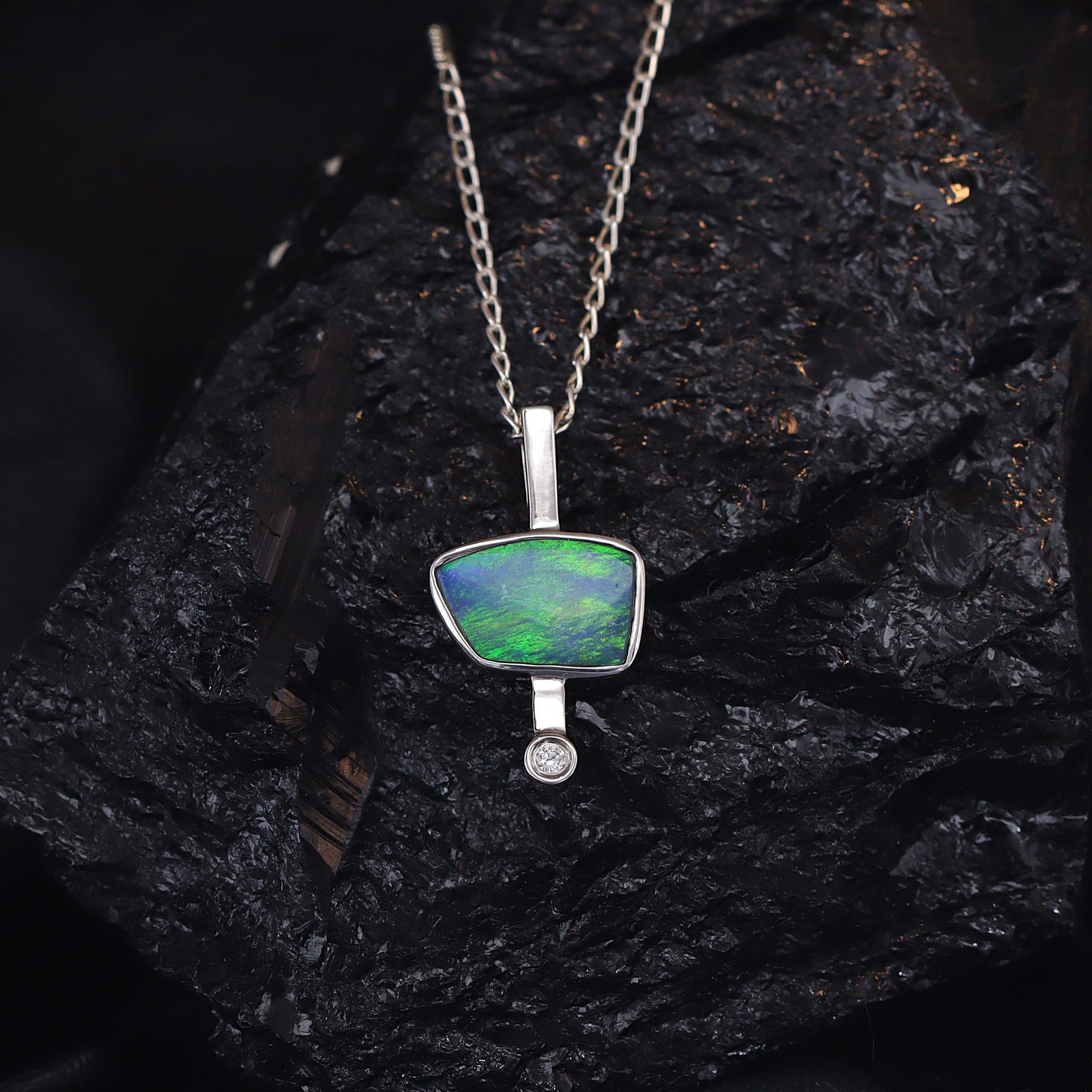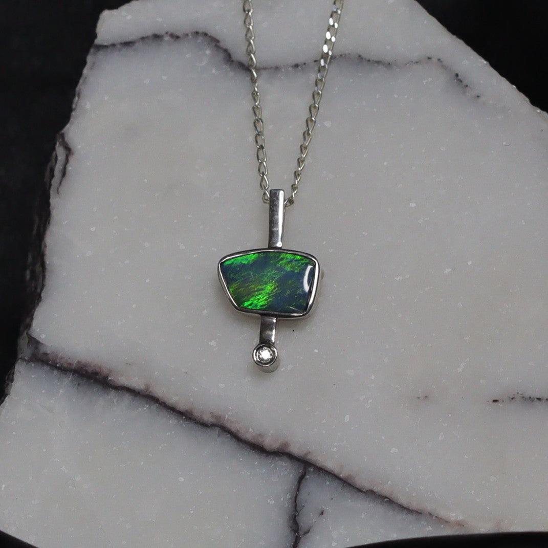 A vibrant green opal doublet shines at the center of this sterling silver pendant, beautifully complemented by a small sparkling zircon. Unique yet effortlessly elegant, it’s a must-have piece that adds timeless charm and individuality to any collection.