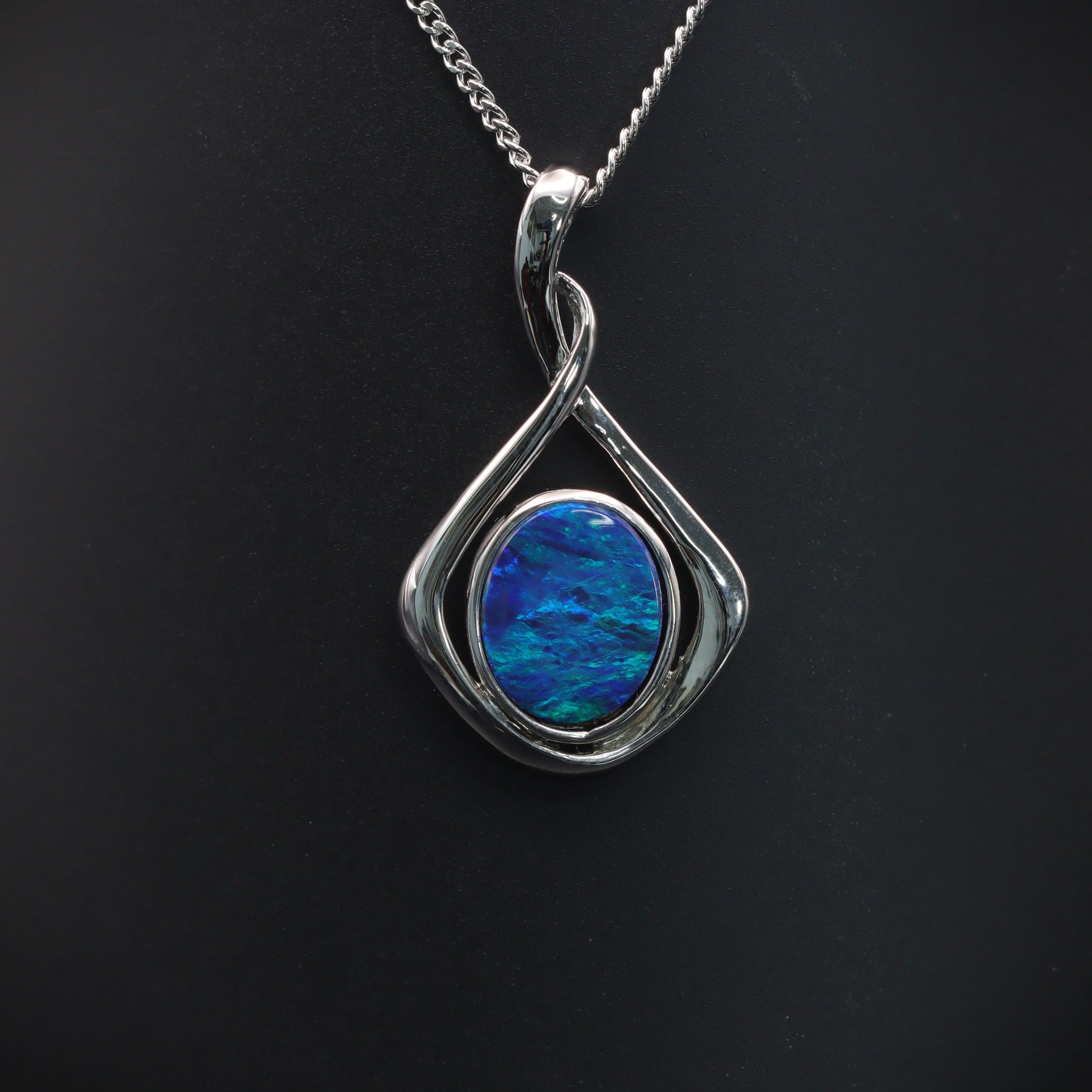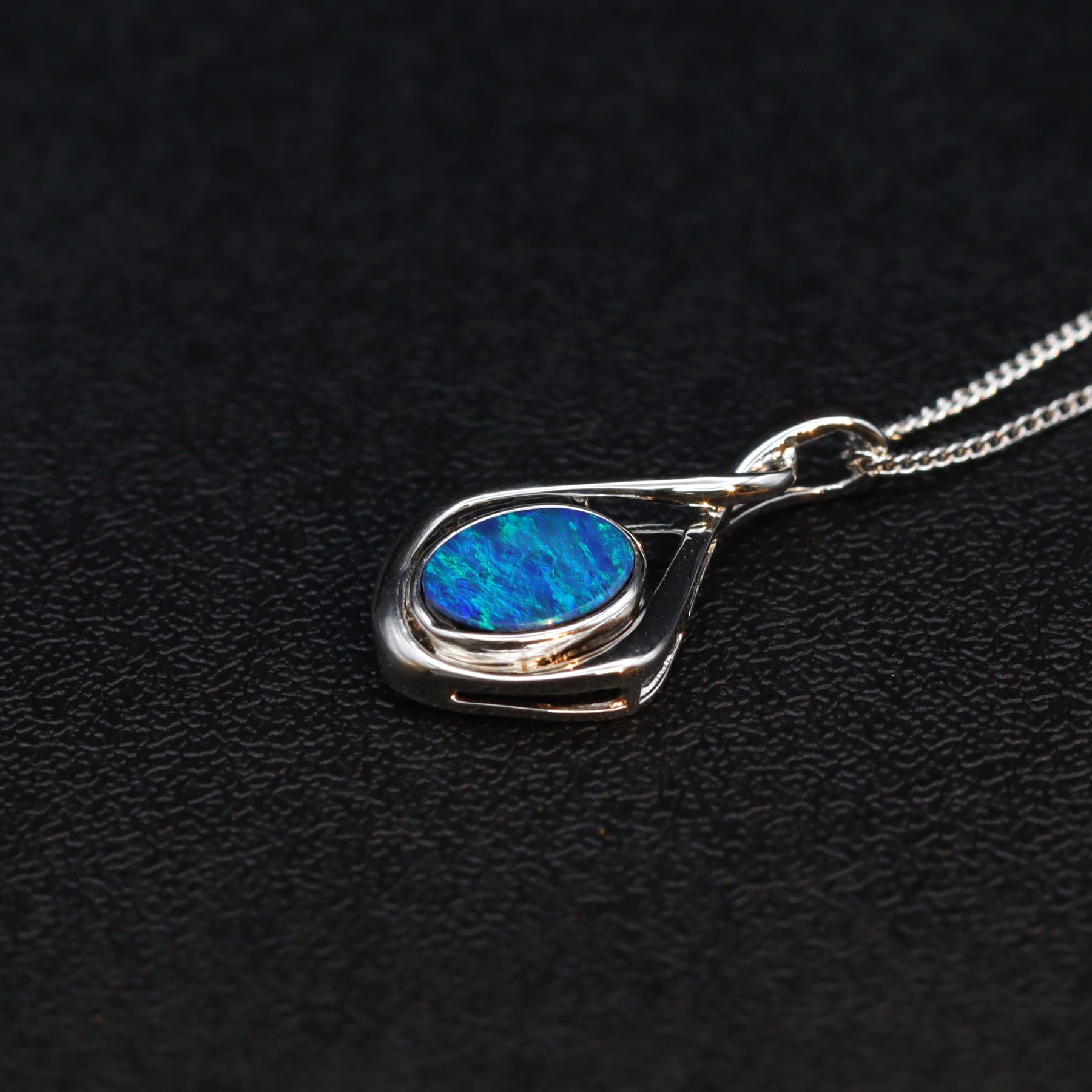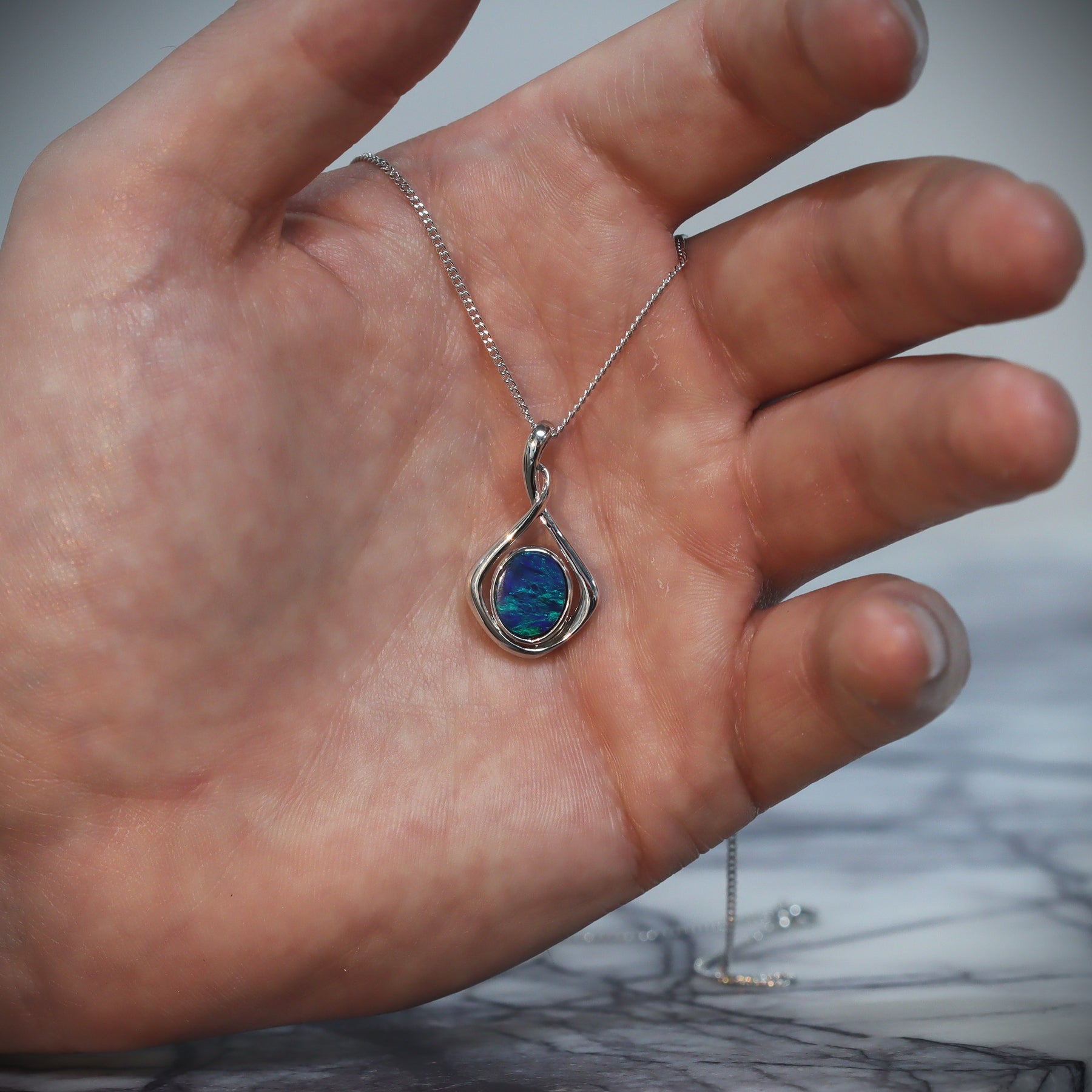 This Australian opal doublet pendant features a captivating blue-green opal, gracefully set in sterling silver. The necklace enhances the stone’s natural luminosity, making it a timeless and sophisticated piece for opal collectors and gemstone lovers.