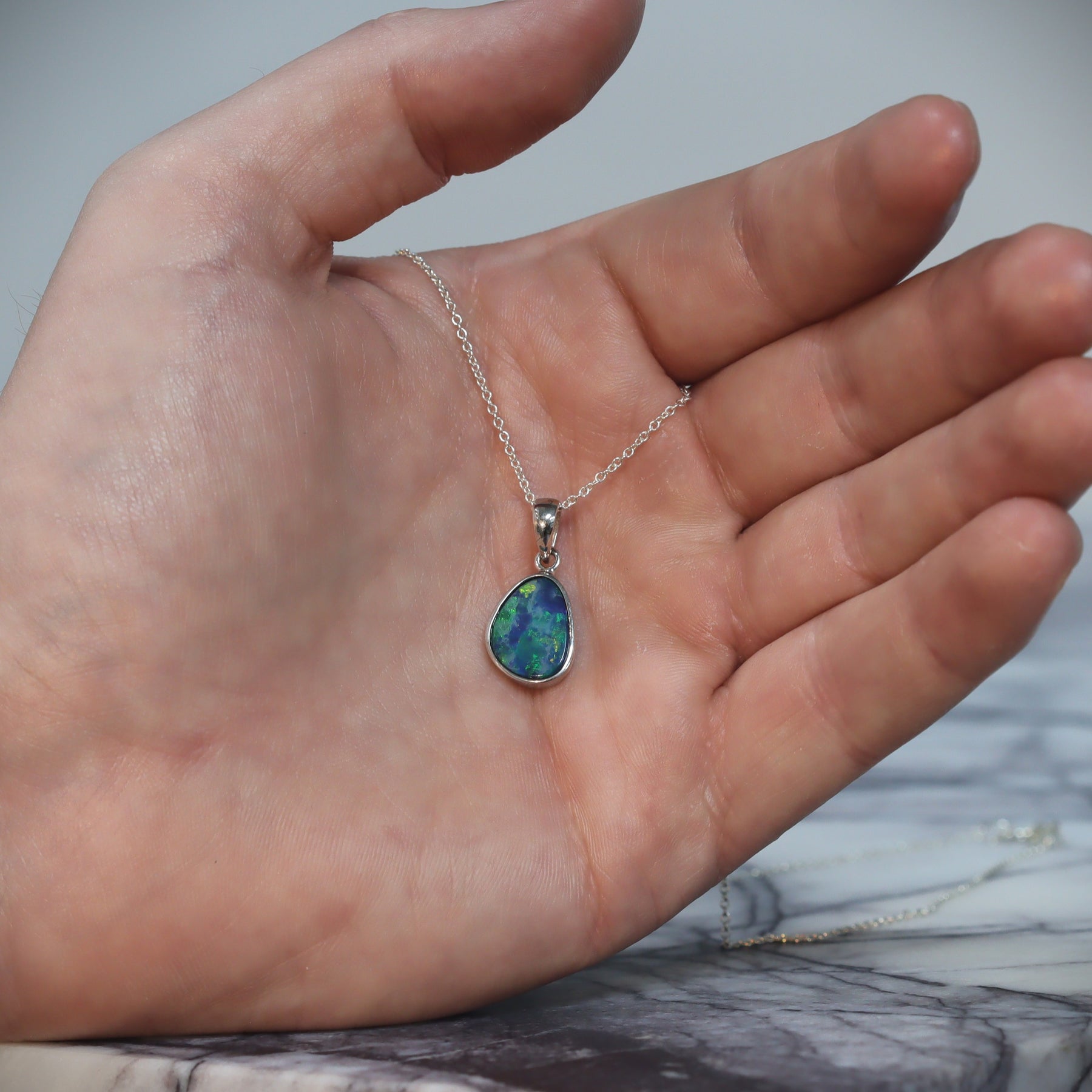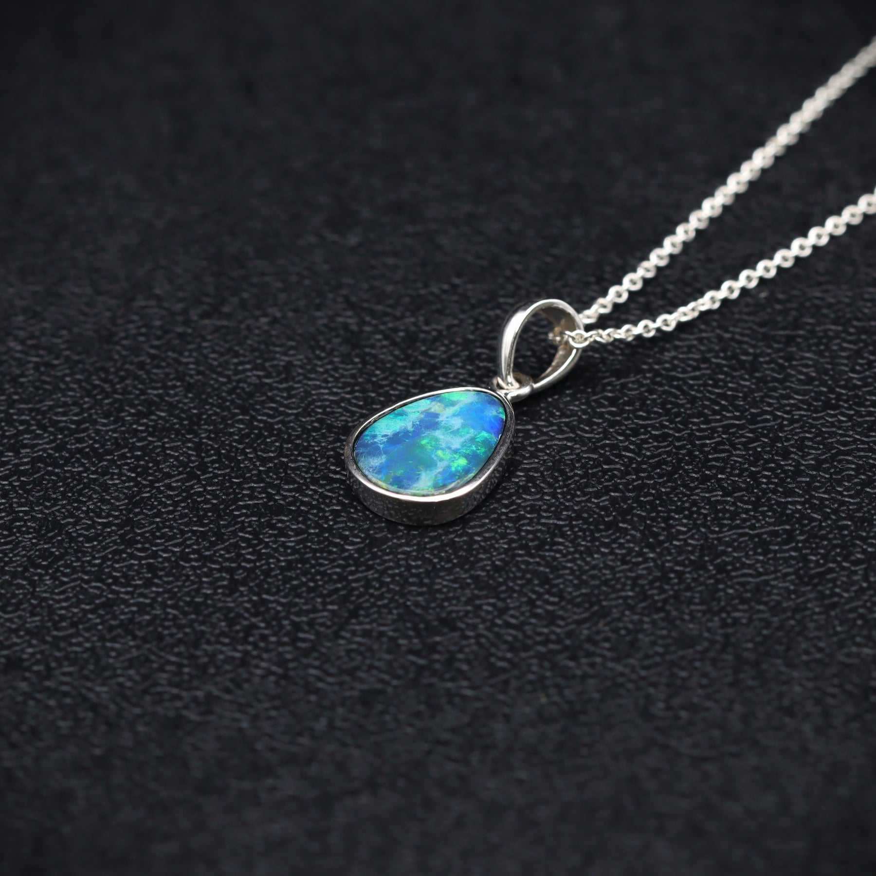 Featuring a luminous blue-green Australian opal doublet, this pendant is beautifully set in sterling silver. Its refined design enhances the stone’s natural brilliance, making it a classic choice for opal lovers and collectors.