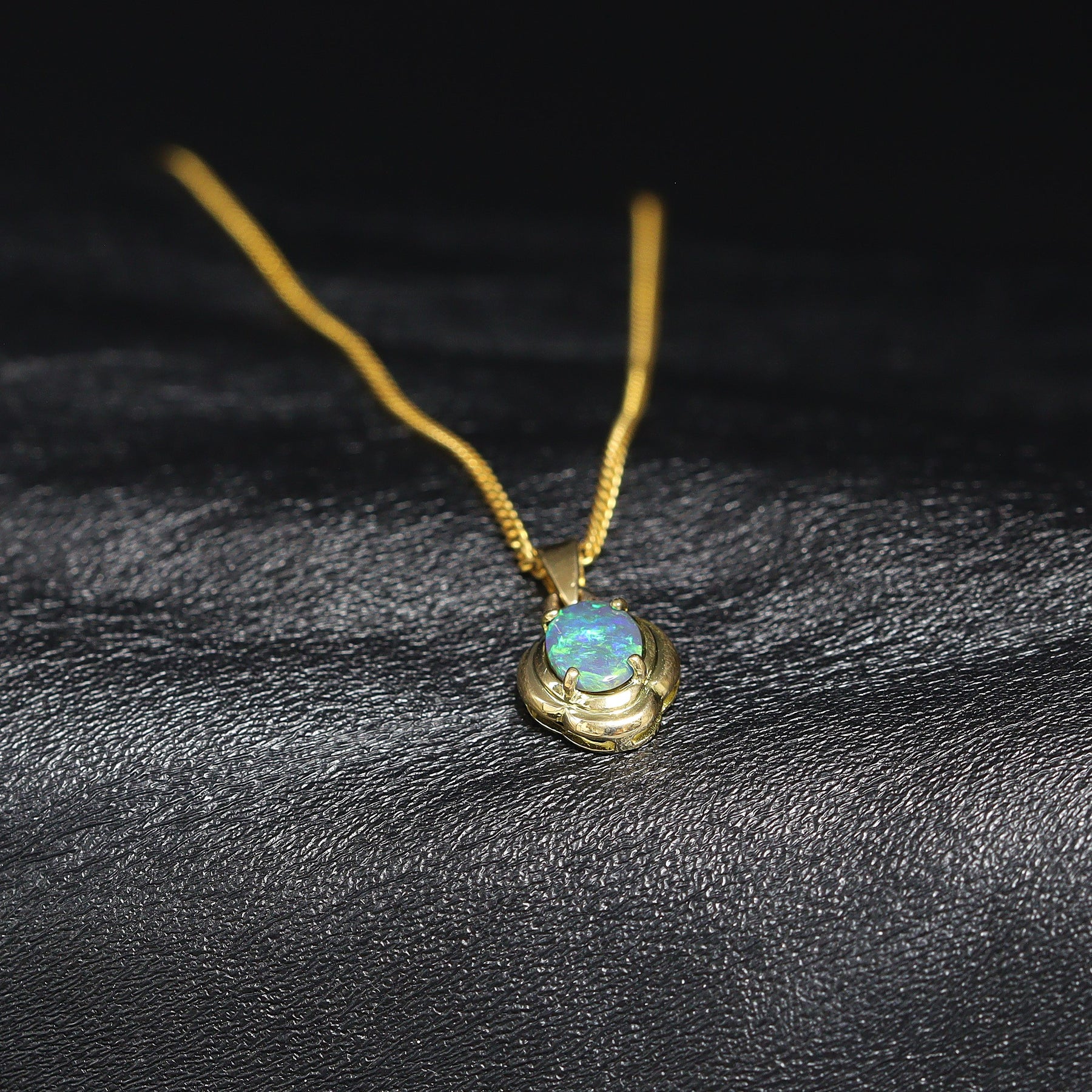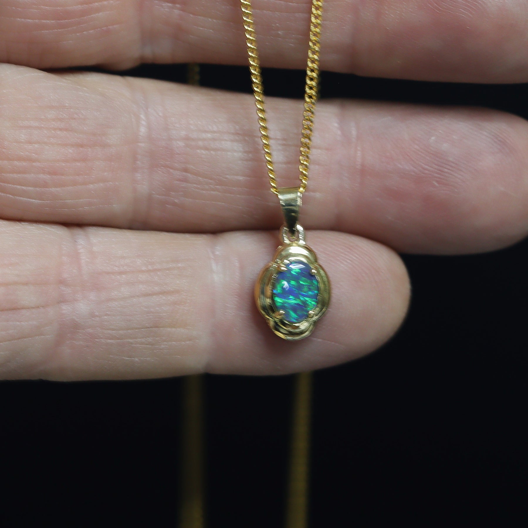 This pendant features a natural solid Australian Black Opal with a beautiful play of colour, mostly dark green. Set in 18K yellow gold, simply and beautiful. Handcrafted in Australia and ideal as a meaningful gift or personal keepsake.