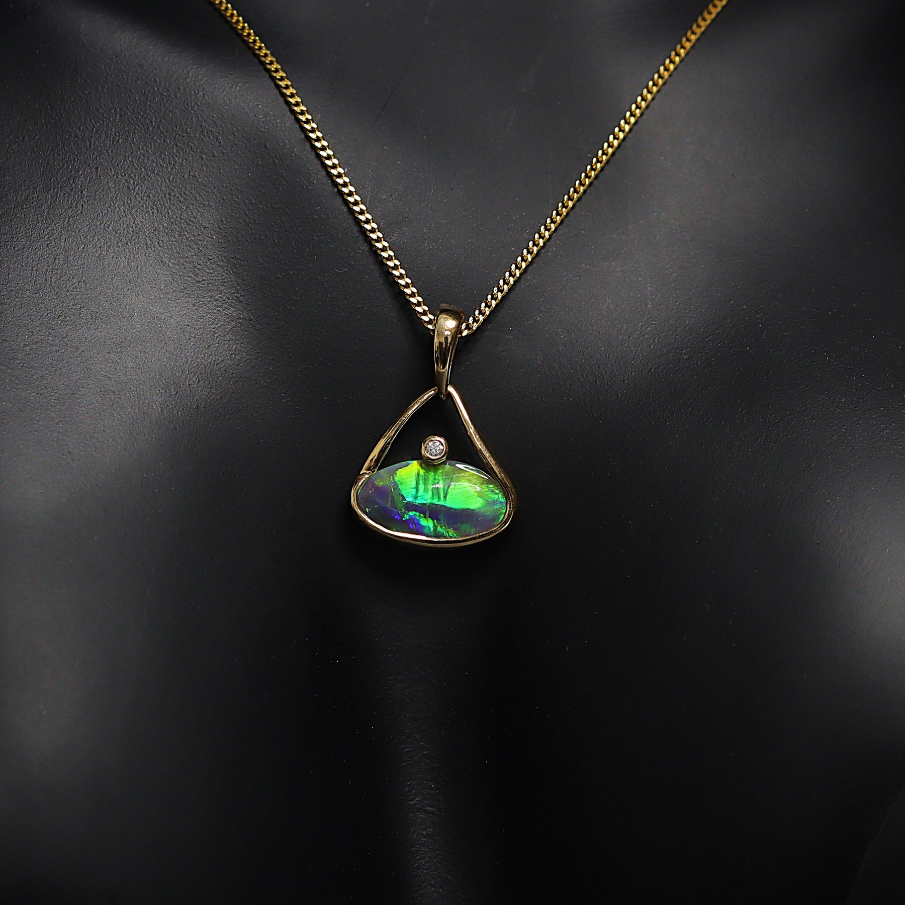 Experience the elegance of this natural solid Australian Black Opal crystal pendant, featuring a vibrant play of colour highlighted by deep green tones. Handcrafted in Australia and set in premium 18K yellow gold, this exquisite opal pendant offers timeless sophistication—an ideal choice for a meaningful gift or a cherished personal keepsake.