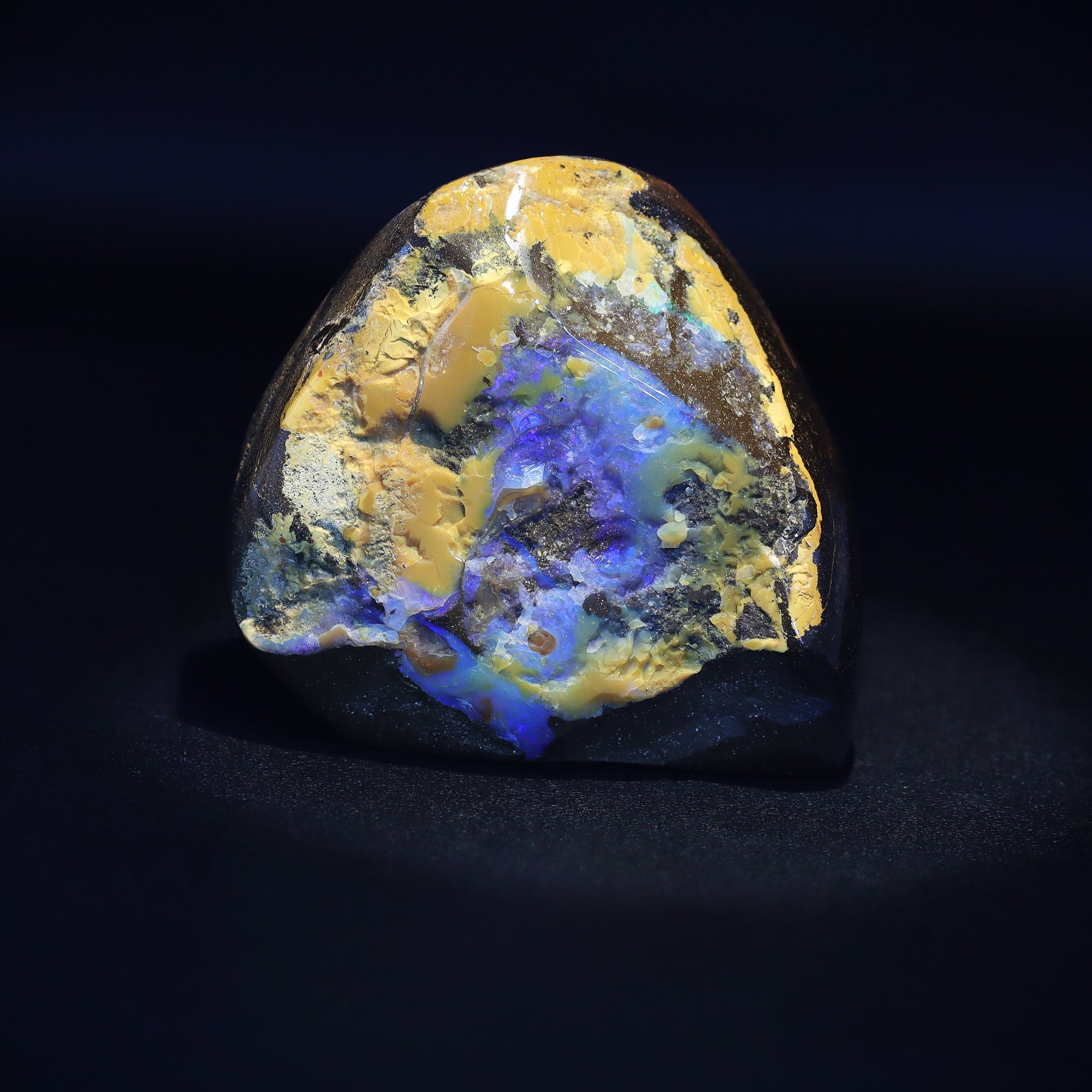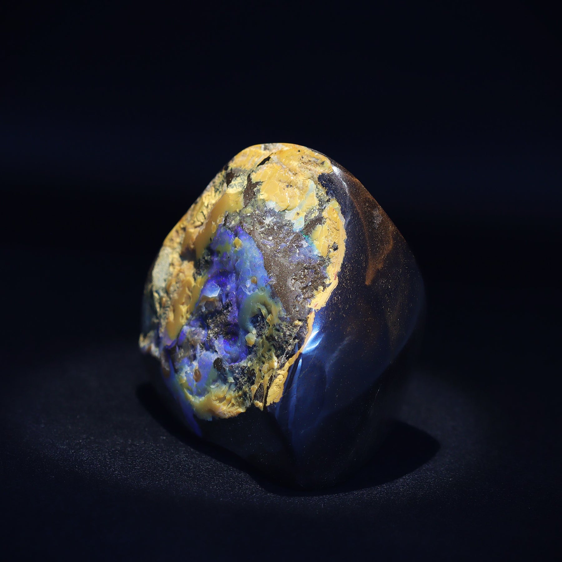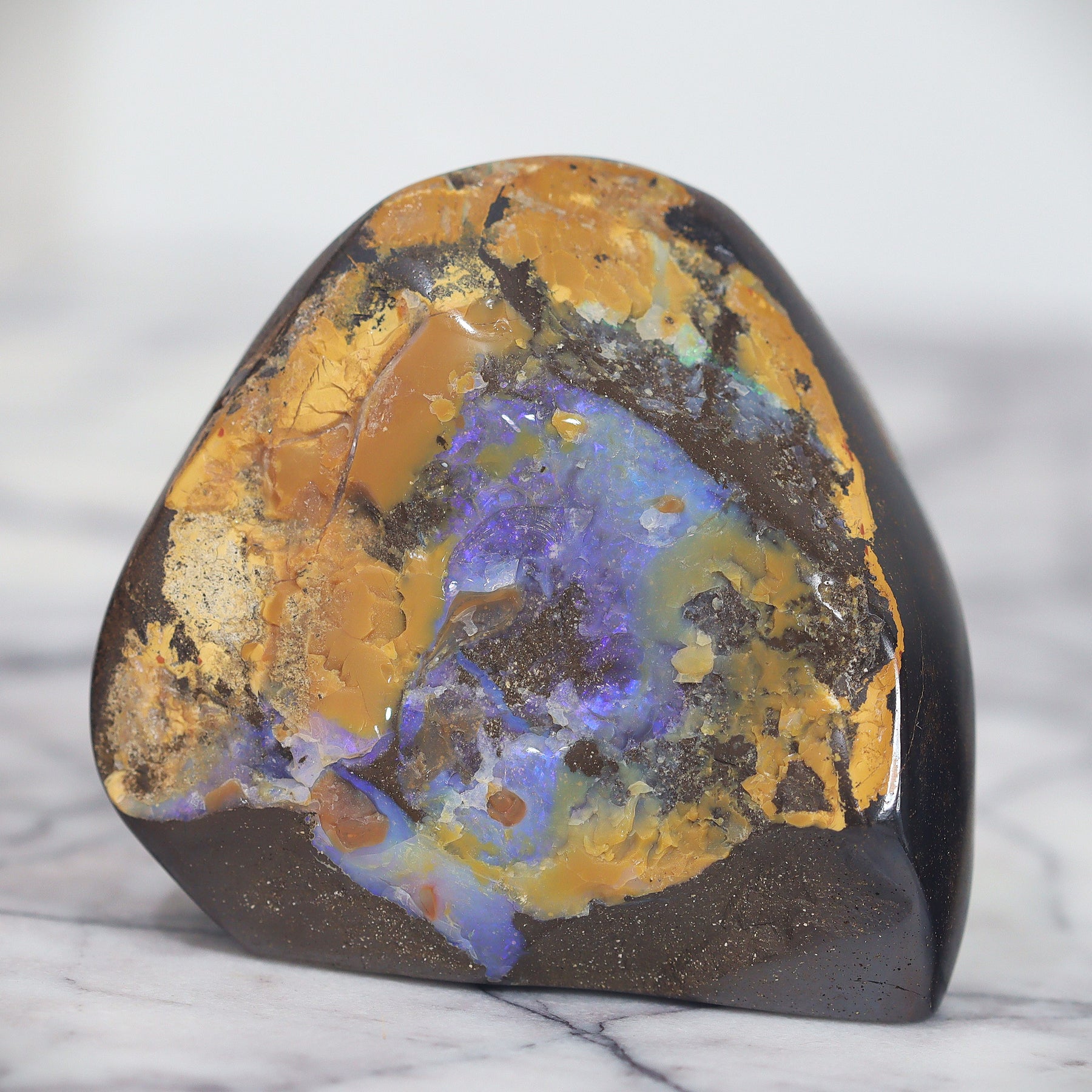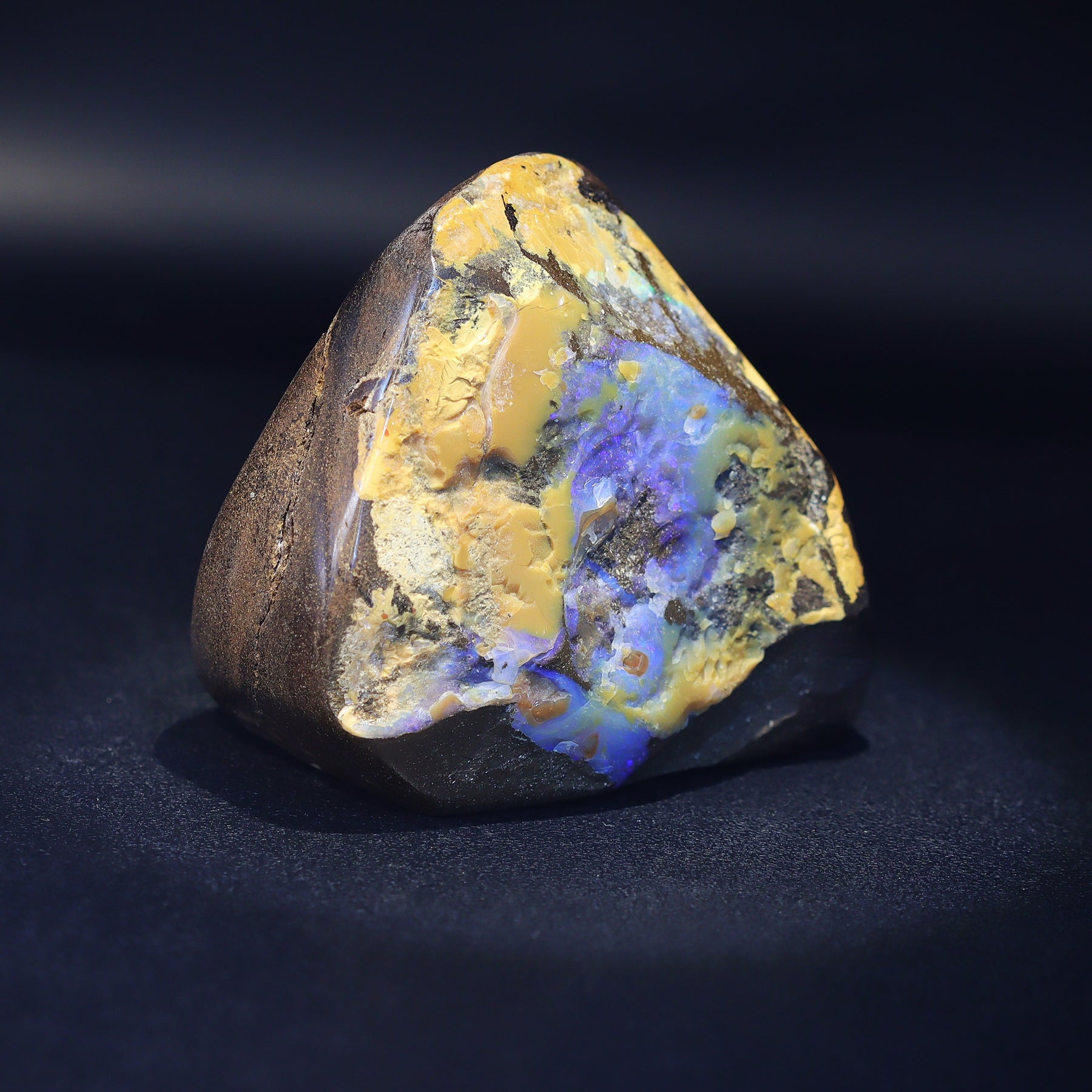This Australian Boulder Opal specimen from southwest Queensland showcases vivid blue opal beautifully accented by sections of clear, colorless opal, creating a stunning natural contrast that highlights the stone’s unique character.