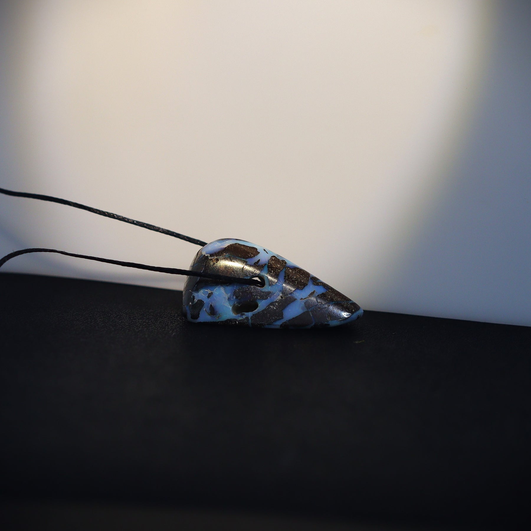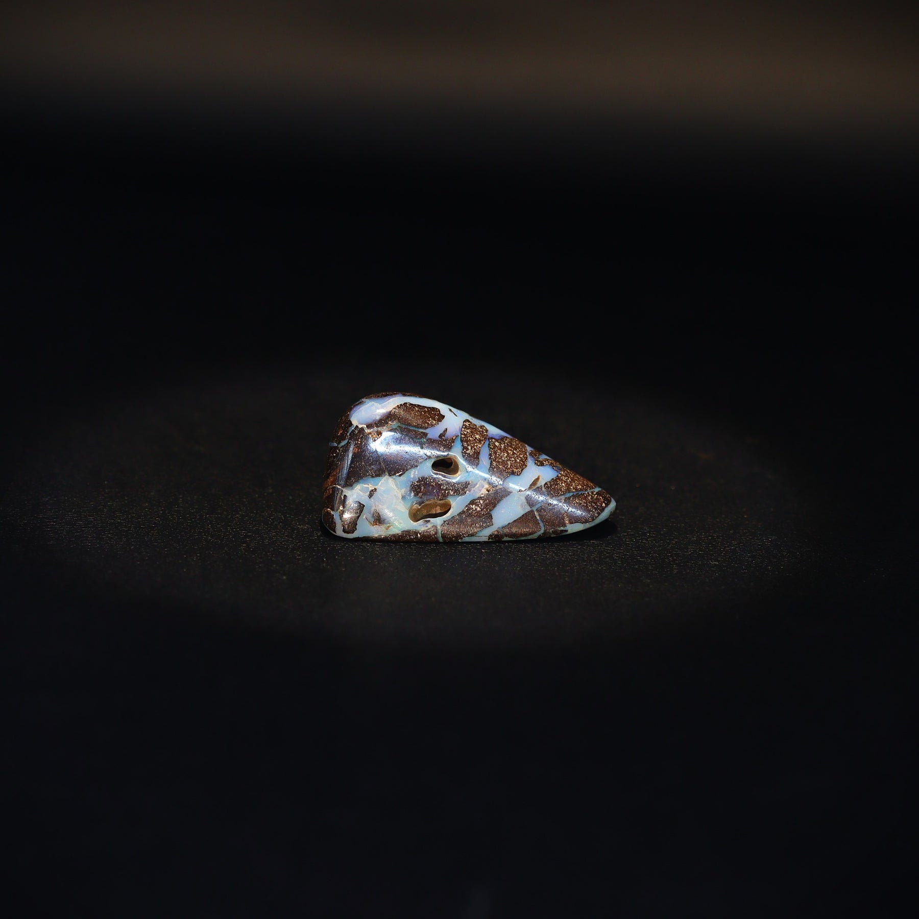 This solid Australian Boulder Opal, mined in South West Queensland, showcases striking natural patterns formed by a blend of light blue opal and ironstone. Its unique colour and pattern make it ideal for creative jewellery designs. Featuring a rare natural hole through the stone, this opal is truly unusual and one of a kind.