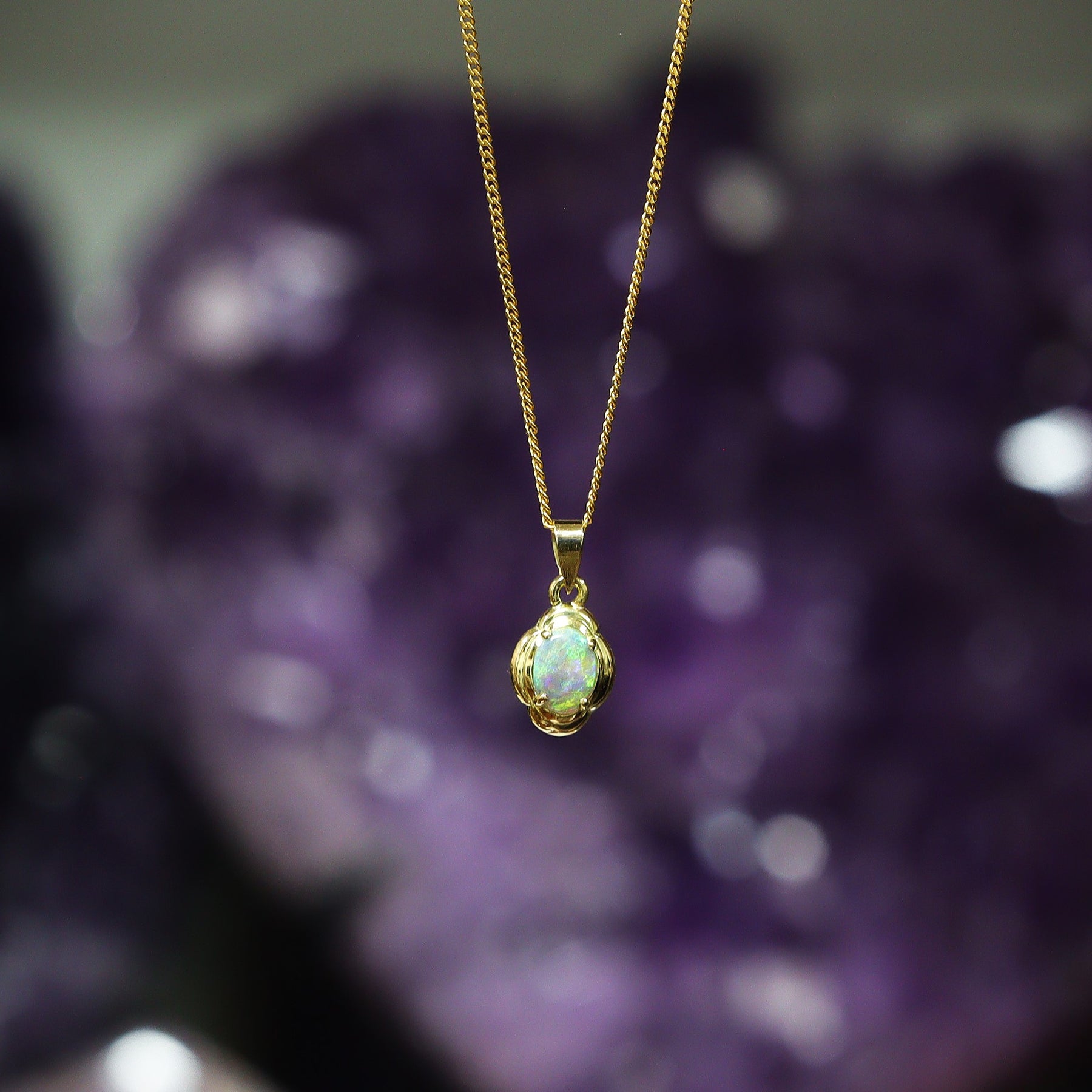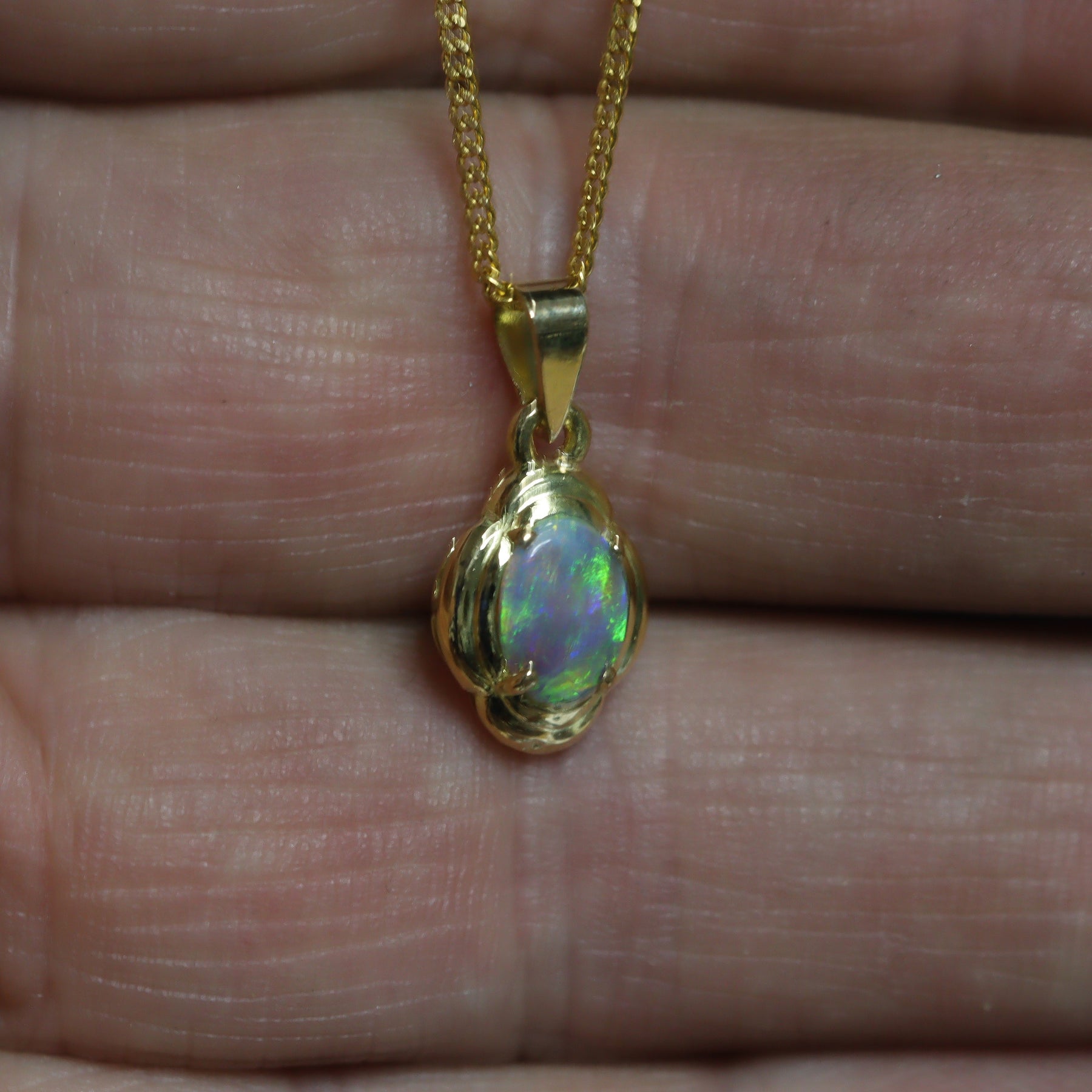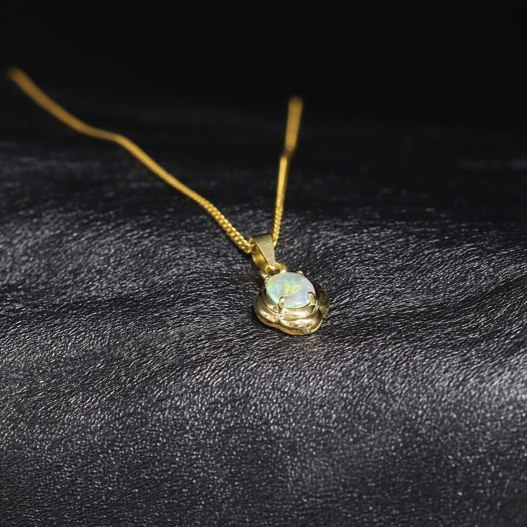 This pendant features a natural solid Australian Black Opal with a beautiful play of colour, mostly green. Set in 18K yellow gold, simply and beautiful. Handcrafted in Australia and ideal as a meaningful gift or personal keepsake.