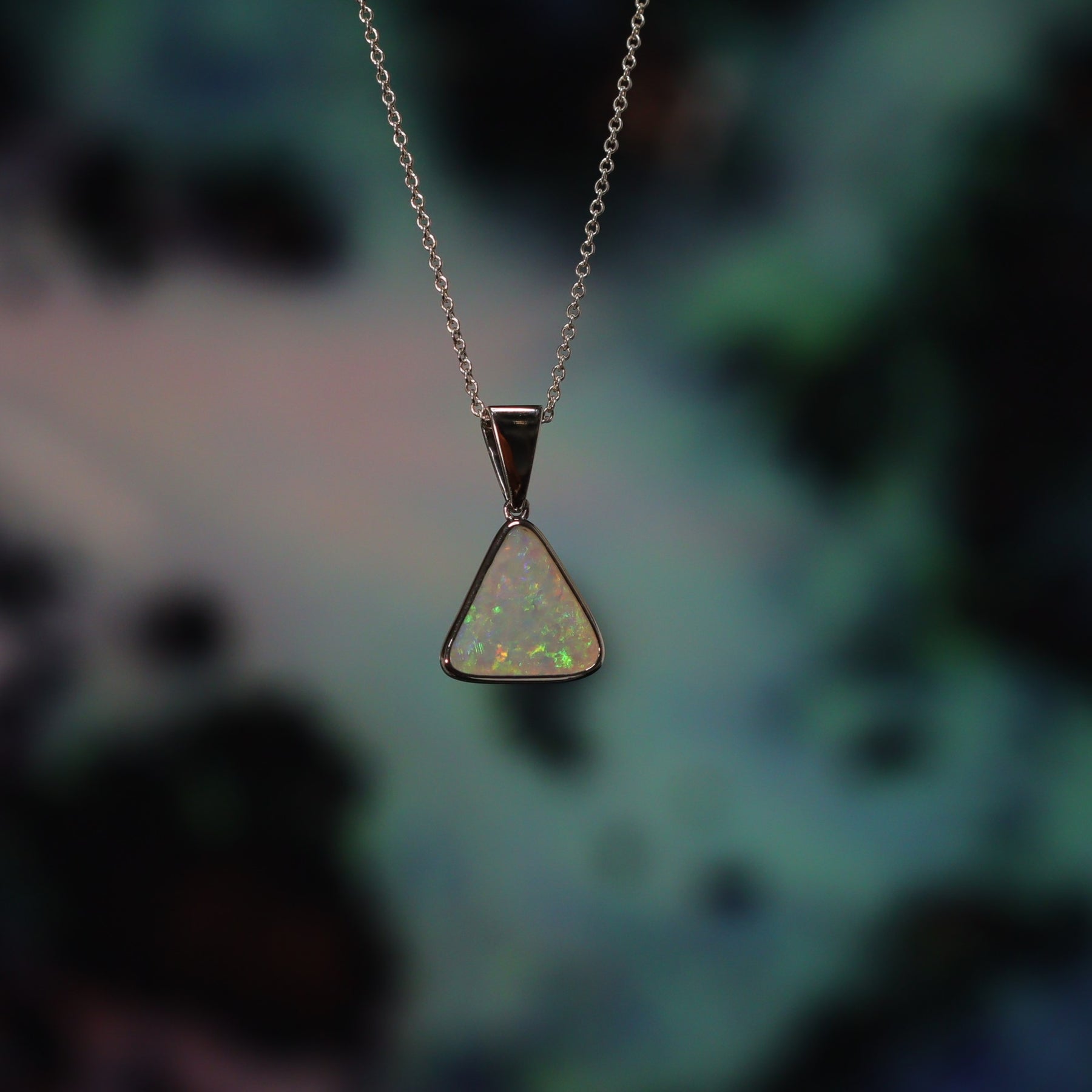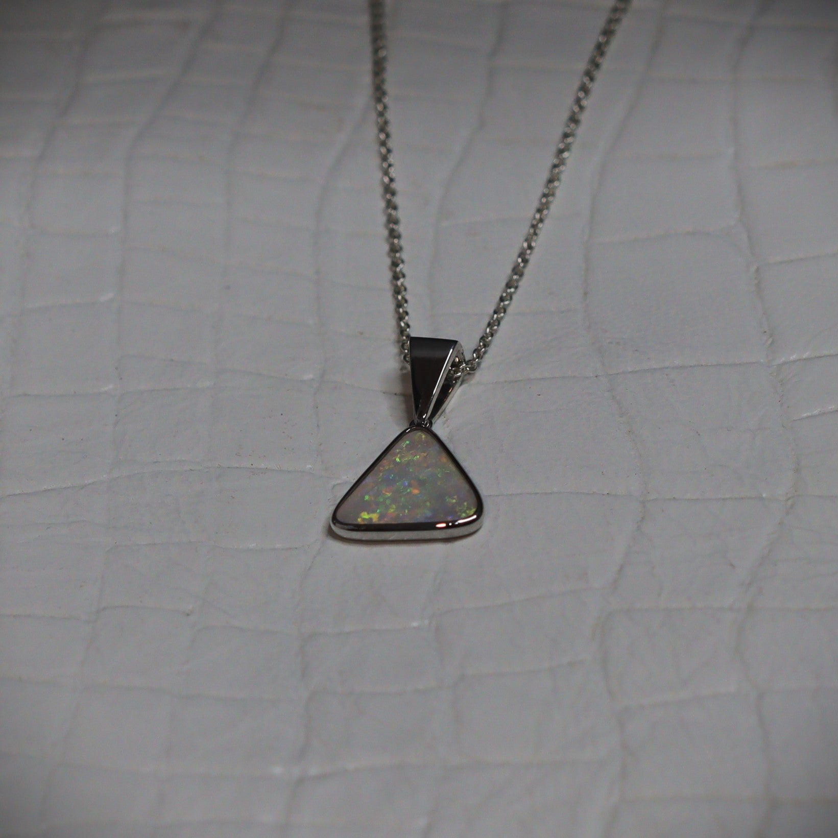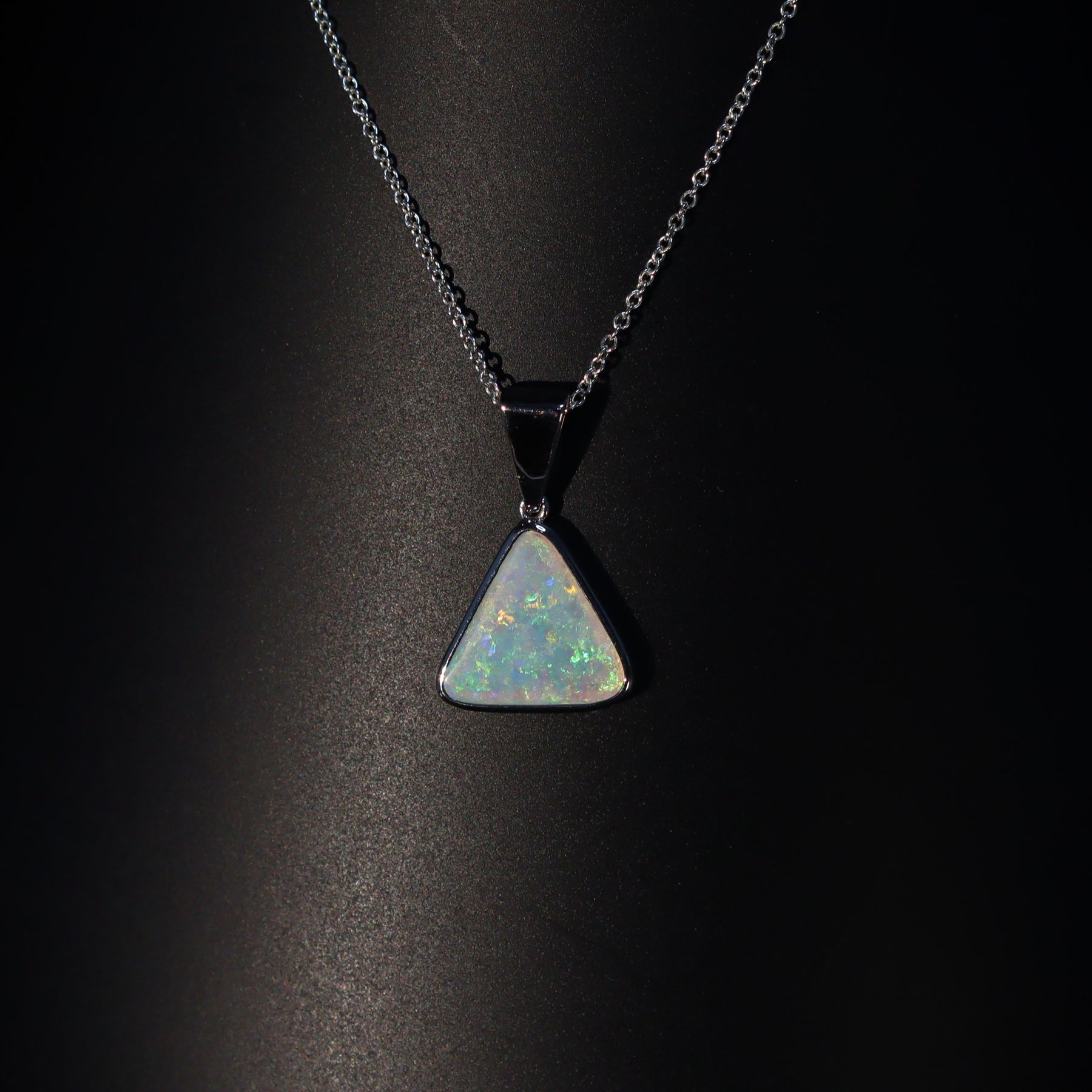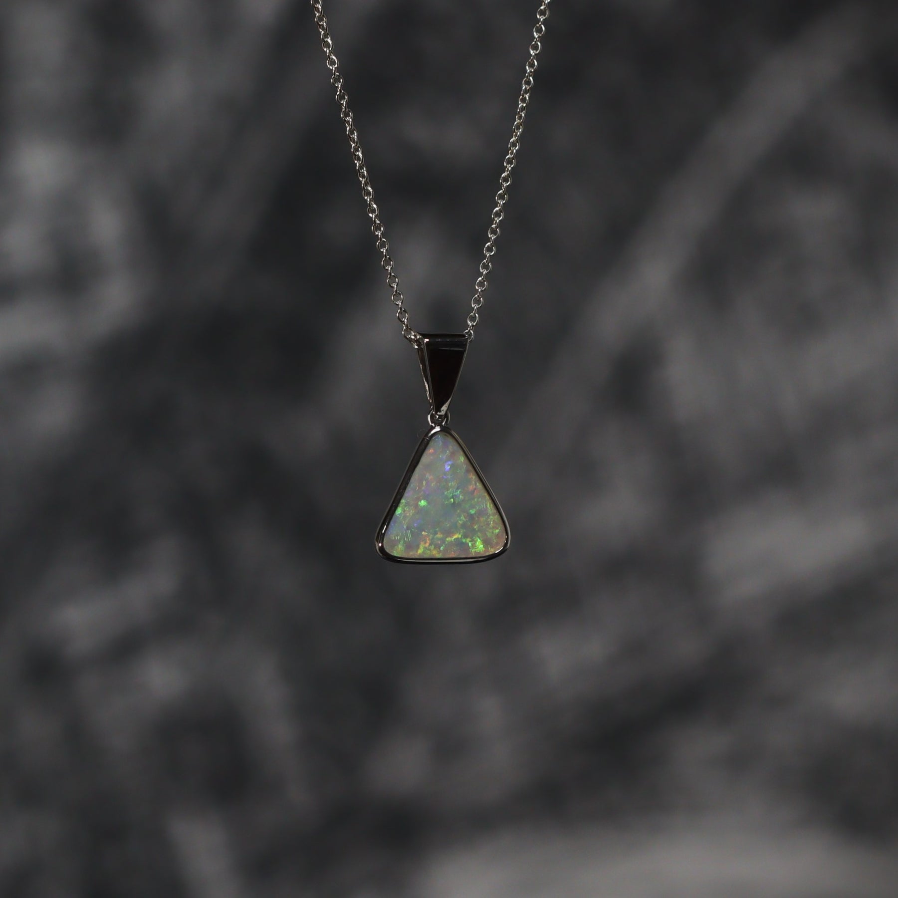 Make a impression with this solid black opal pendant in sterling silver. Featuring vivid milticolor flashes and a rare triangular shape, it’s a striking piece that truly stands out.