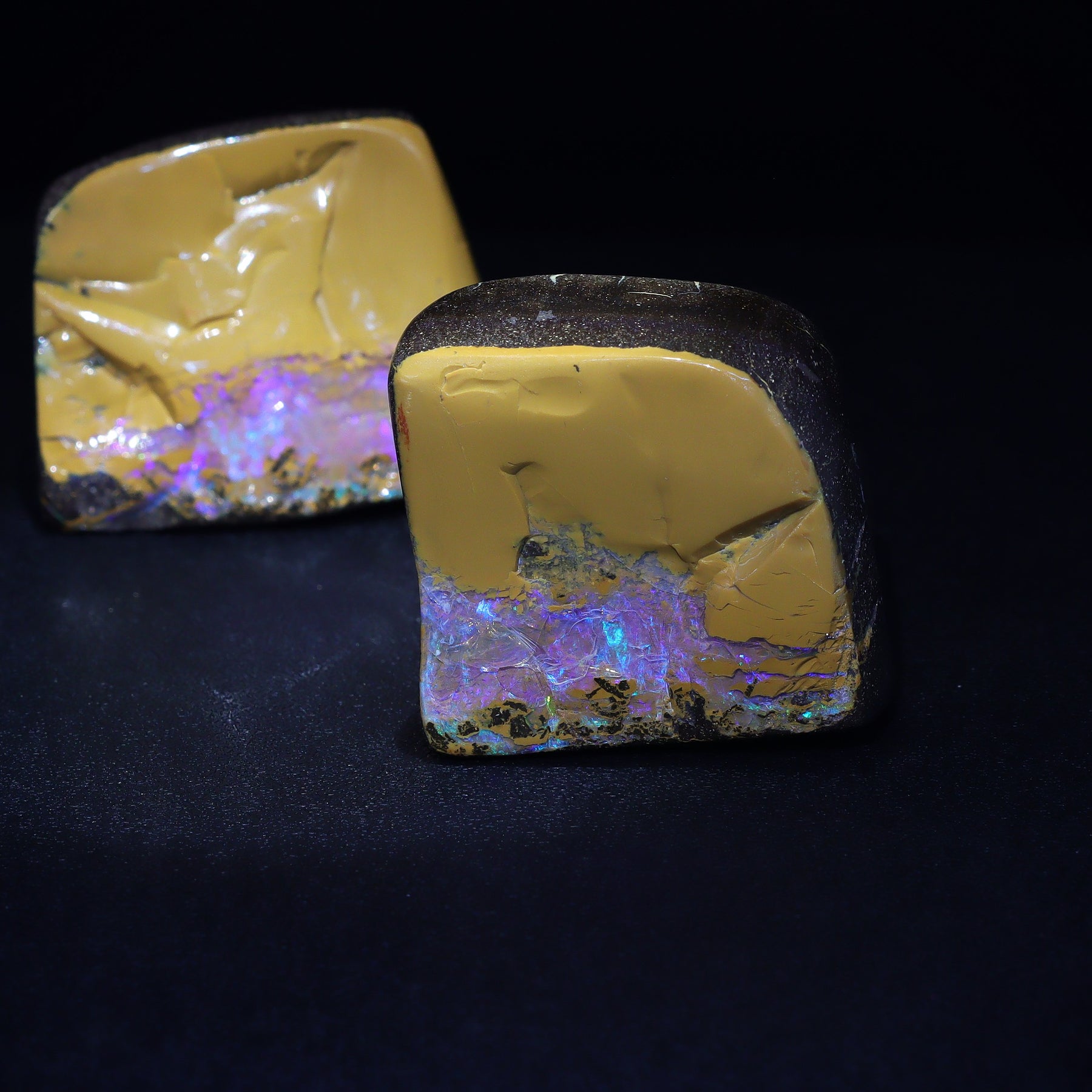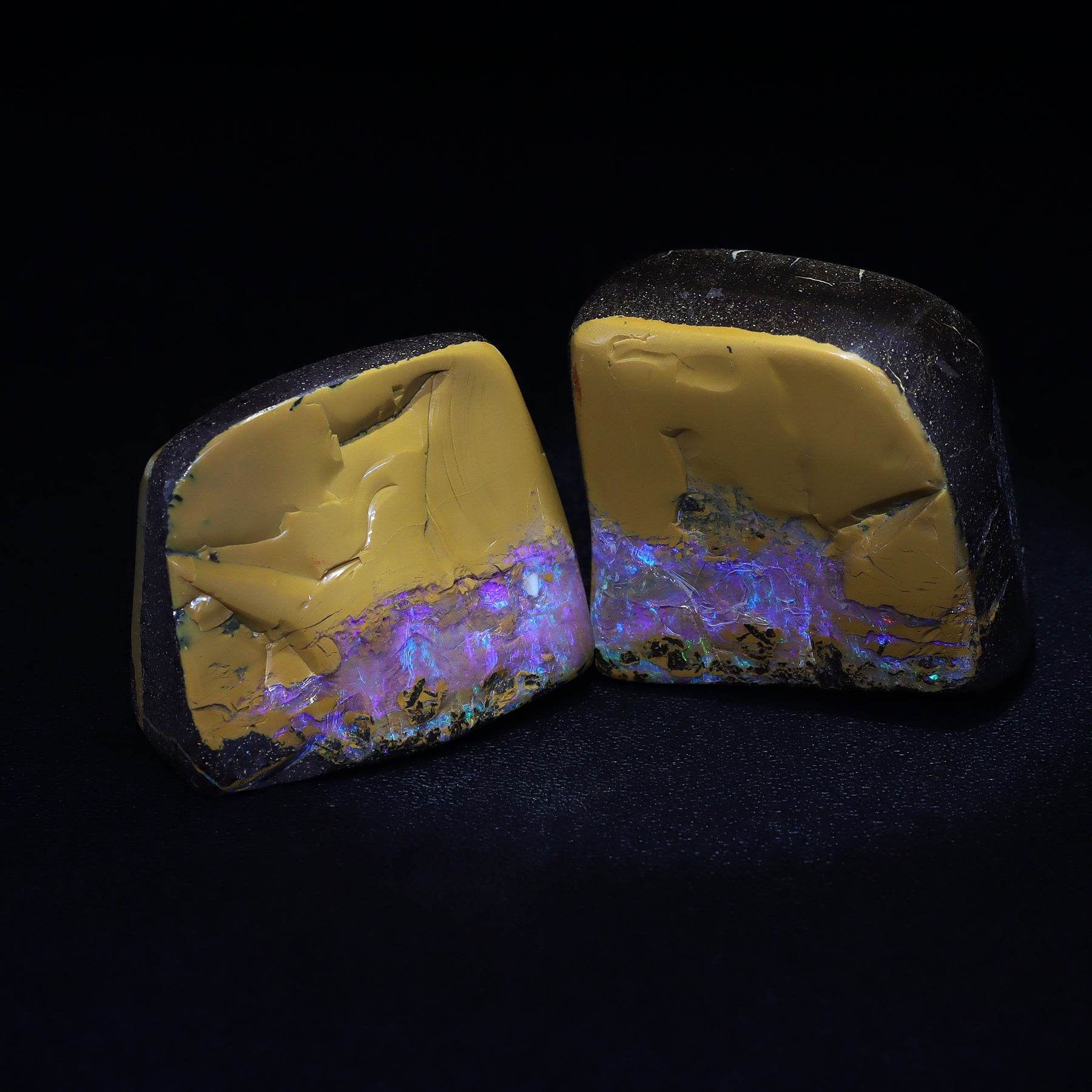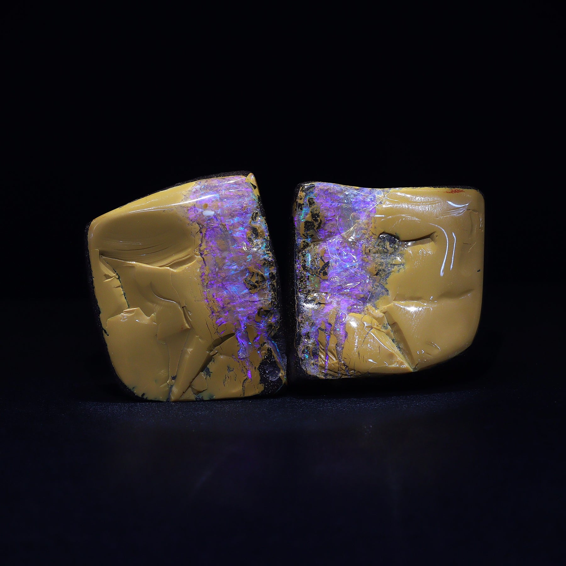 This Australian Boulder Opal split pair from southwest Queensland features vivid violet opal contrasted with clear, colorless opal, creating a naturally striking visual balance that enhances the stone’s unique beauty and character. Opal split pairs occur exclusively in boulder opal, forming when an opal vein runs through the host rock and, under specific natural conditions, separates into two matching pieces.