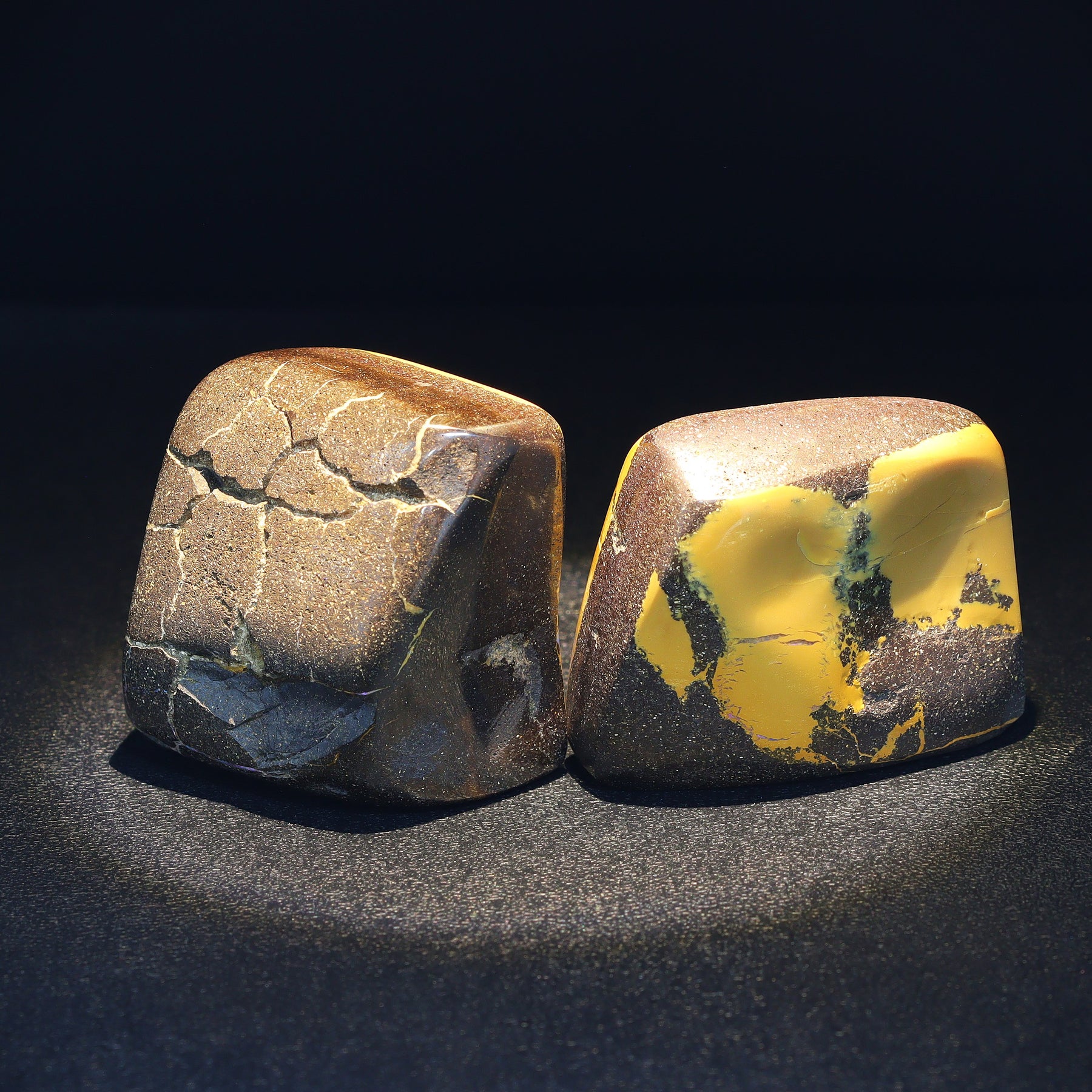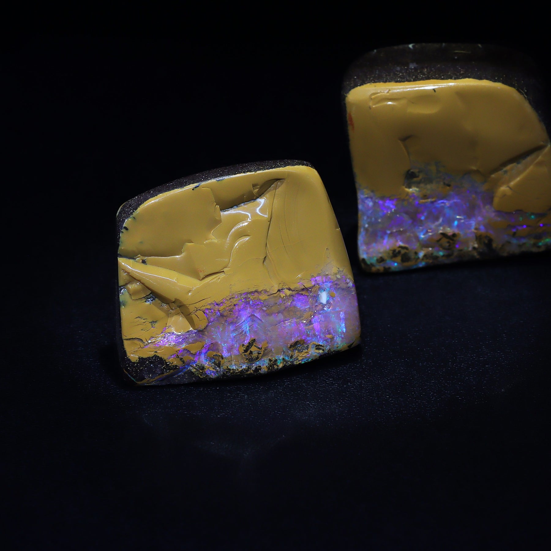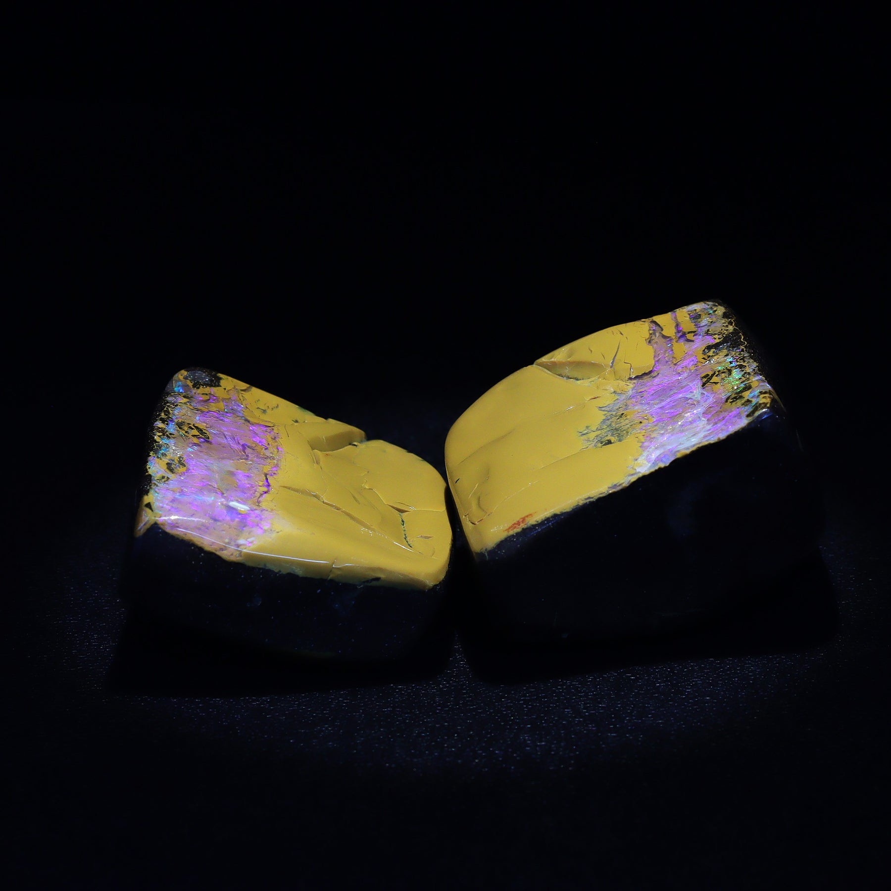 This Australian Boulder Opal split pair from southwest Queensland features vivid violet opal contrasted with clear, colorless opal, creating a naturally striking visual balance that enhances the stone’s unique beauty and character. Opal split pairs occur exclusively in boulder opal, forming when an opal vein runs through the host rock and, under specific natural conditions, separates into two matching pieces.