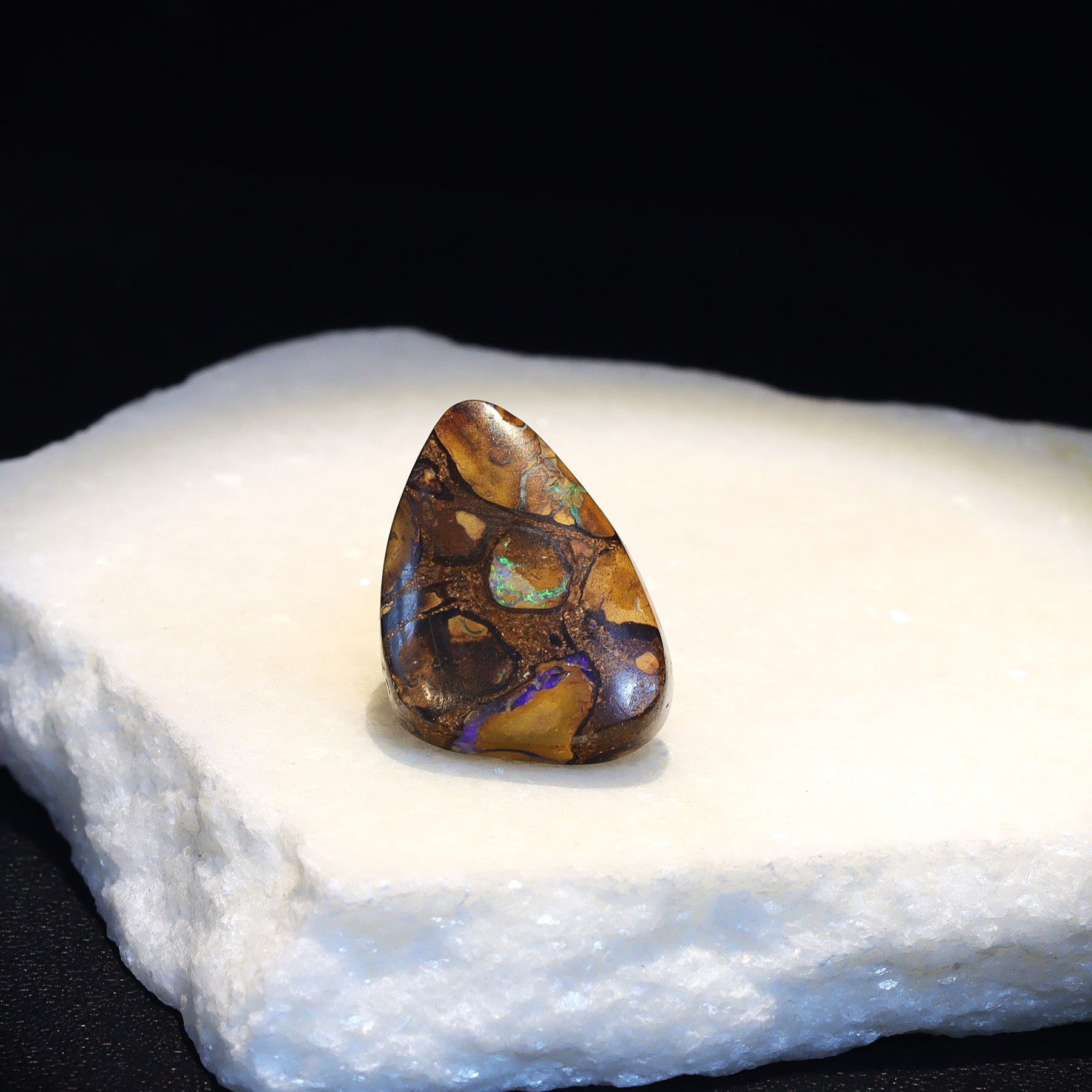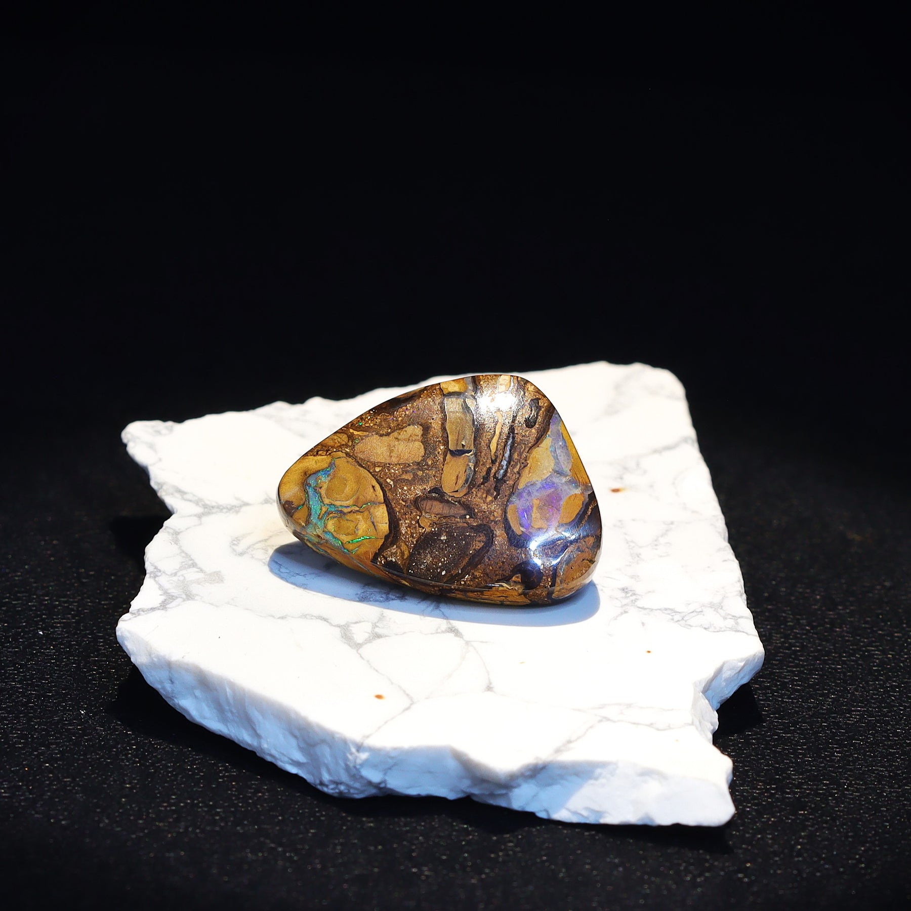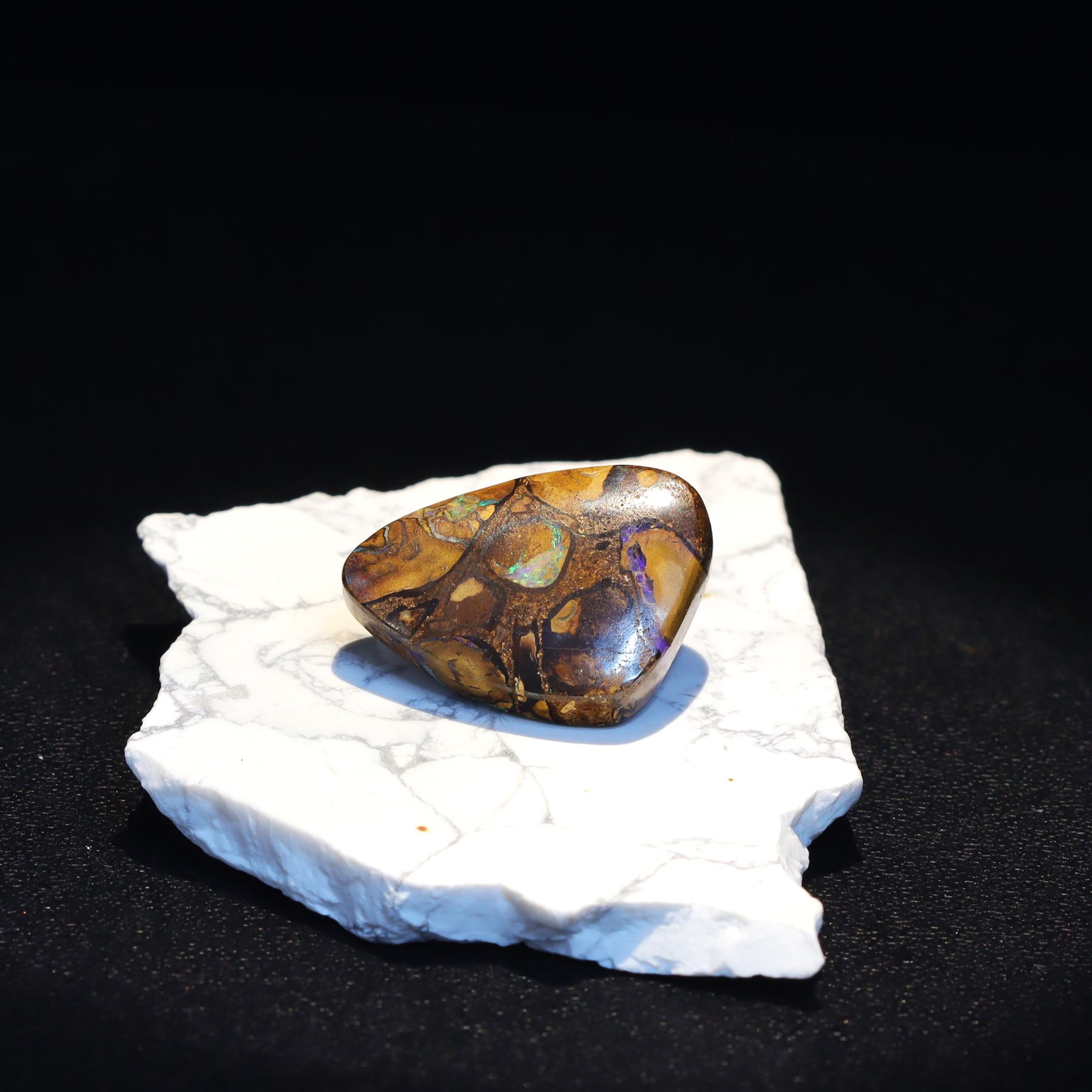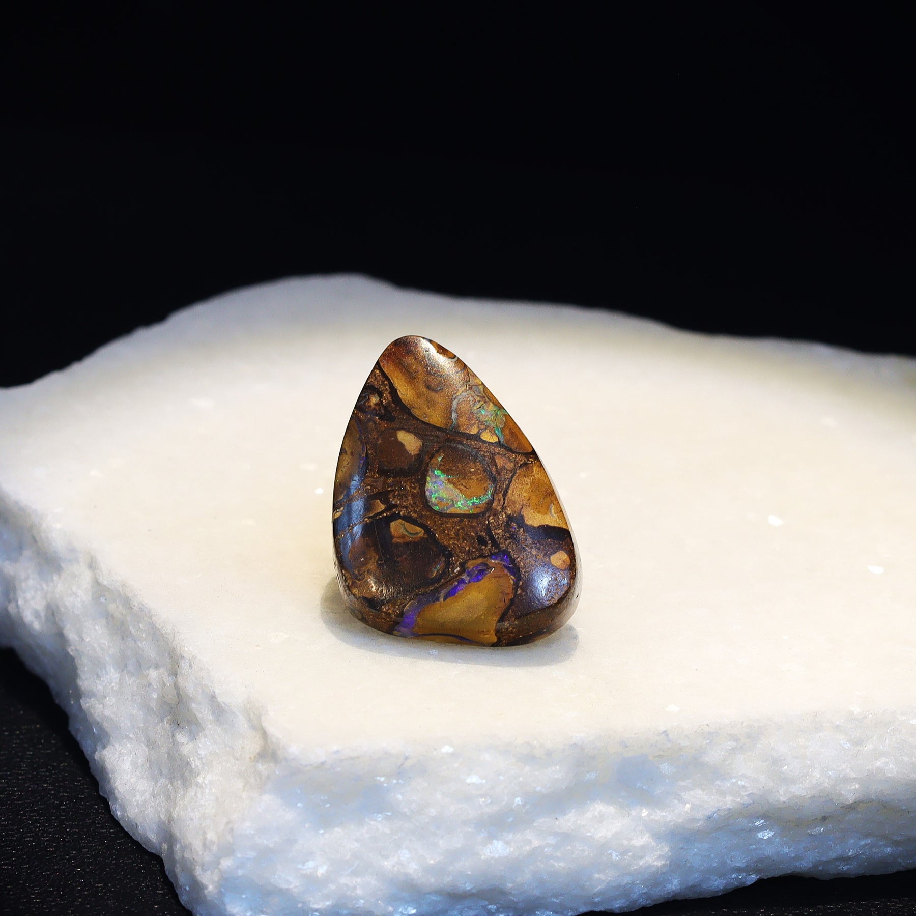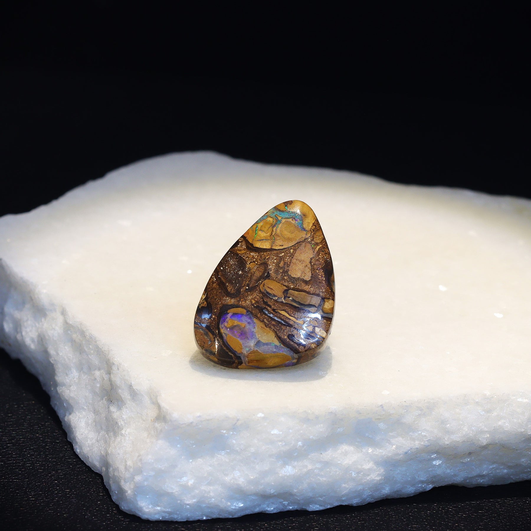 Solid Australian Boulder Opal sourced from the renowned opal fields of South West Queensland, showcasing a captivating natural pattern where vibrant opal veins blend seamlessly with earthy ironstone. The unique interplay of colour and matrix creates an appearance reminiscent of an artistic painting, making each stone a true natural masterpiece. Highly prized for its individuality and organic beauty, this Queensland boulder opal is perfect for custom jewellery designs or as a distinctive collector’s gemstone. No two pieces are ever alike, highlighting the rare and authentic character of genuine Australian opal.