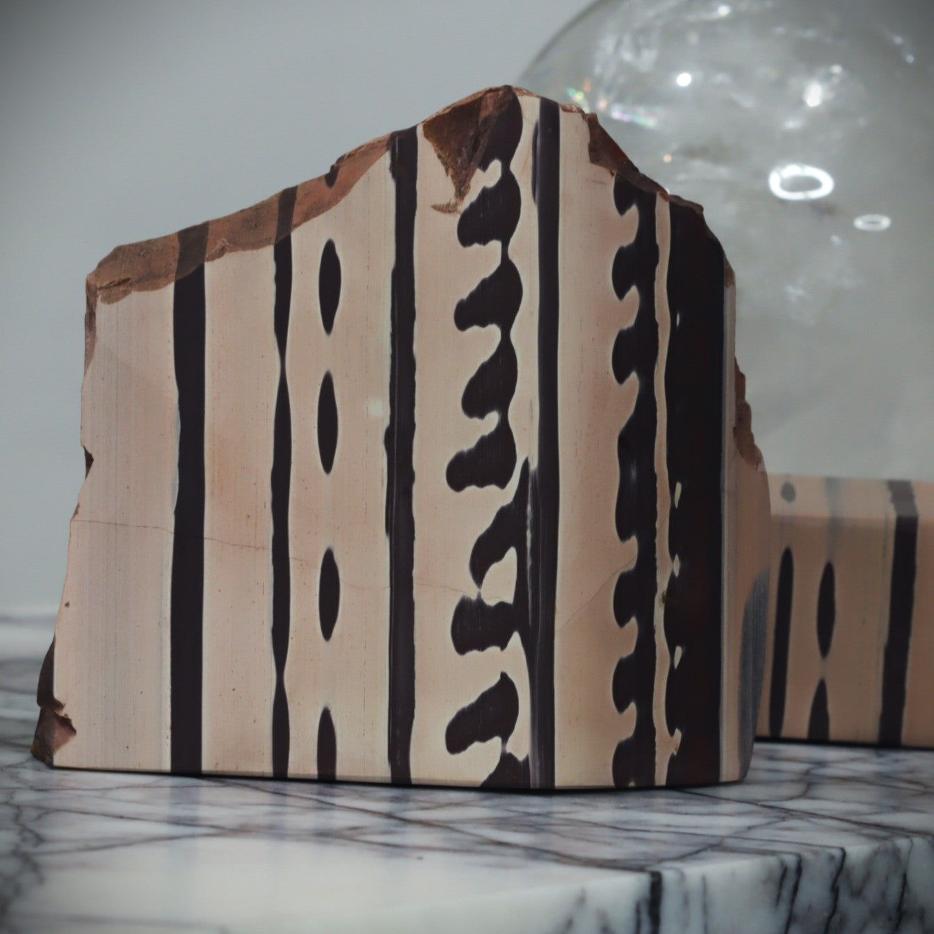This rare Australian Zebra Rock Sphere is crafted from Precambrian argillite and features distinctive red banding and spot patterns that make each piece truly unique. Formed over 600 million years ago, Zebra Rock is found exclusively in the East Kimberley region of Western Australia. Geological evidence suggests it was deposited as sediment in calm, deep marine conditions. The dramatic contrast of red iron oxide markings against a lighter stone base enhances the natural beauty and collectability of this ancient and rare gemstone.
