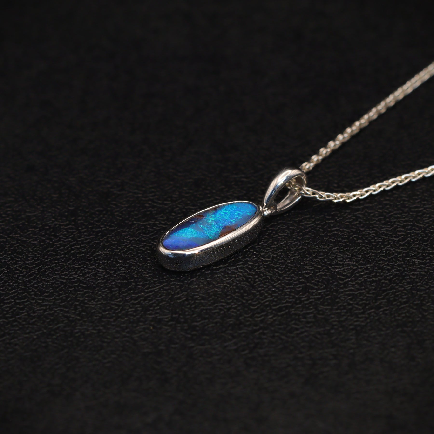 This stunning solid boulder opal pendant reveals mesmerizing tones of green and blue, celebrating the gemstone’s organic beauty. Set in high-quality sterling silver, it radiates elegance and timeless sophistication.