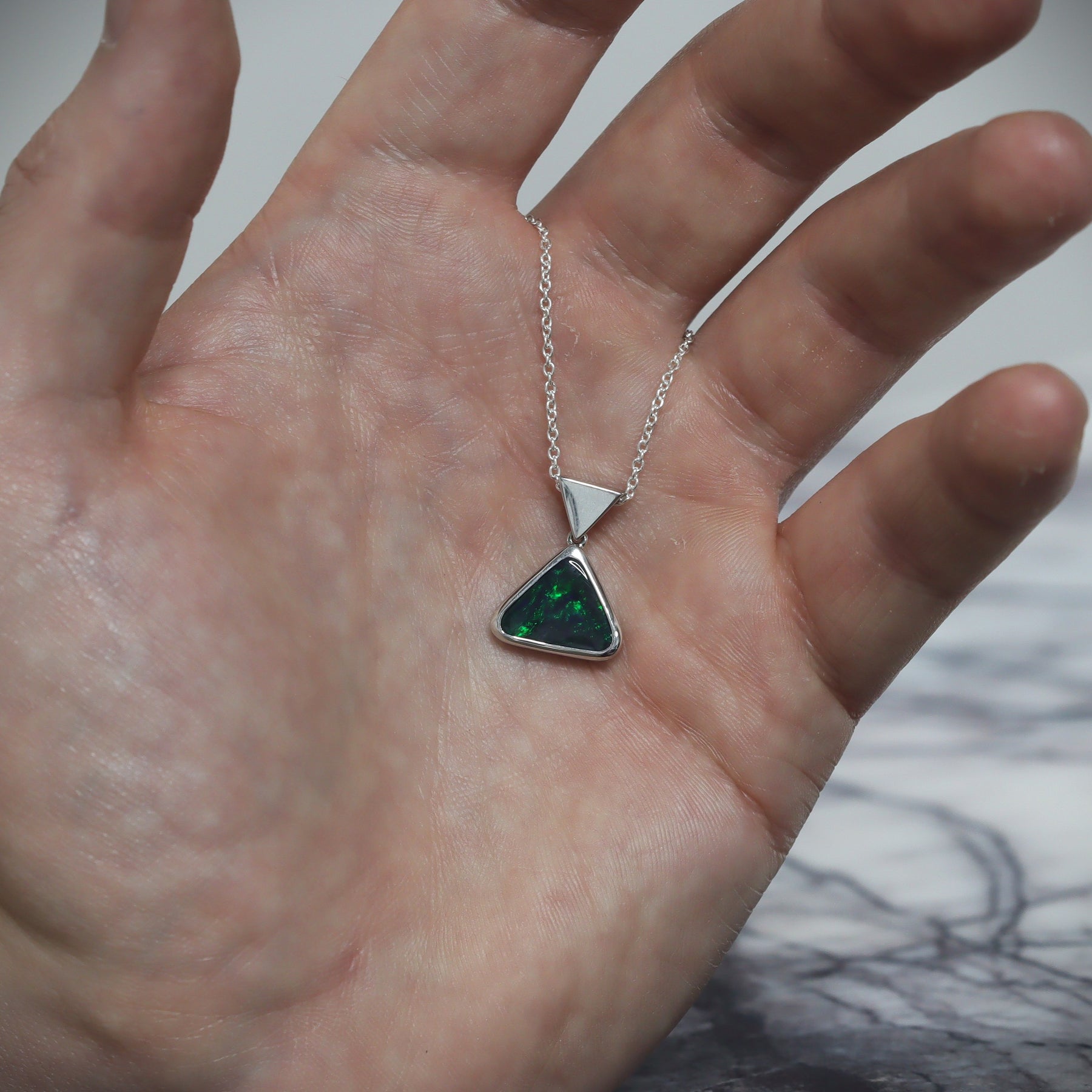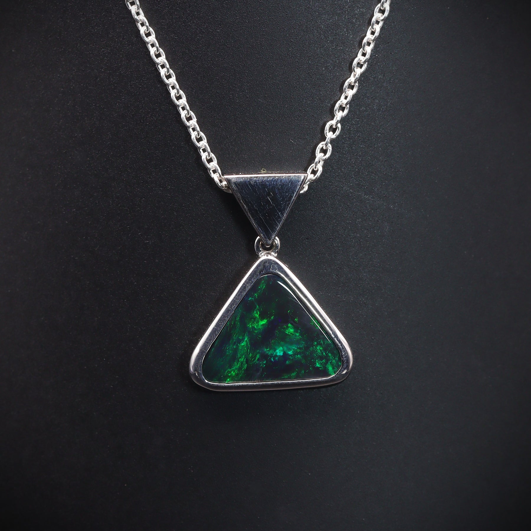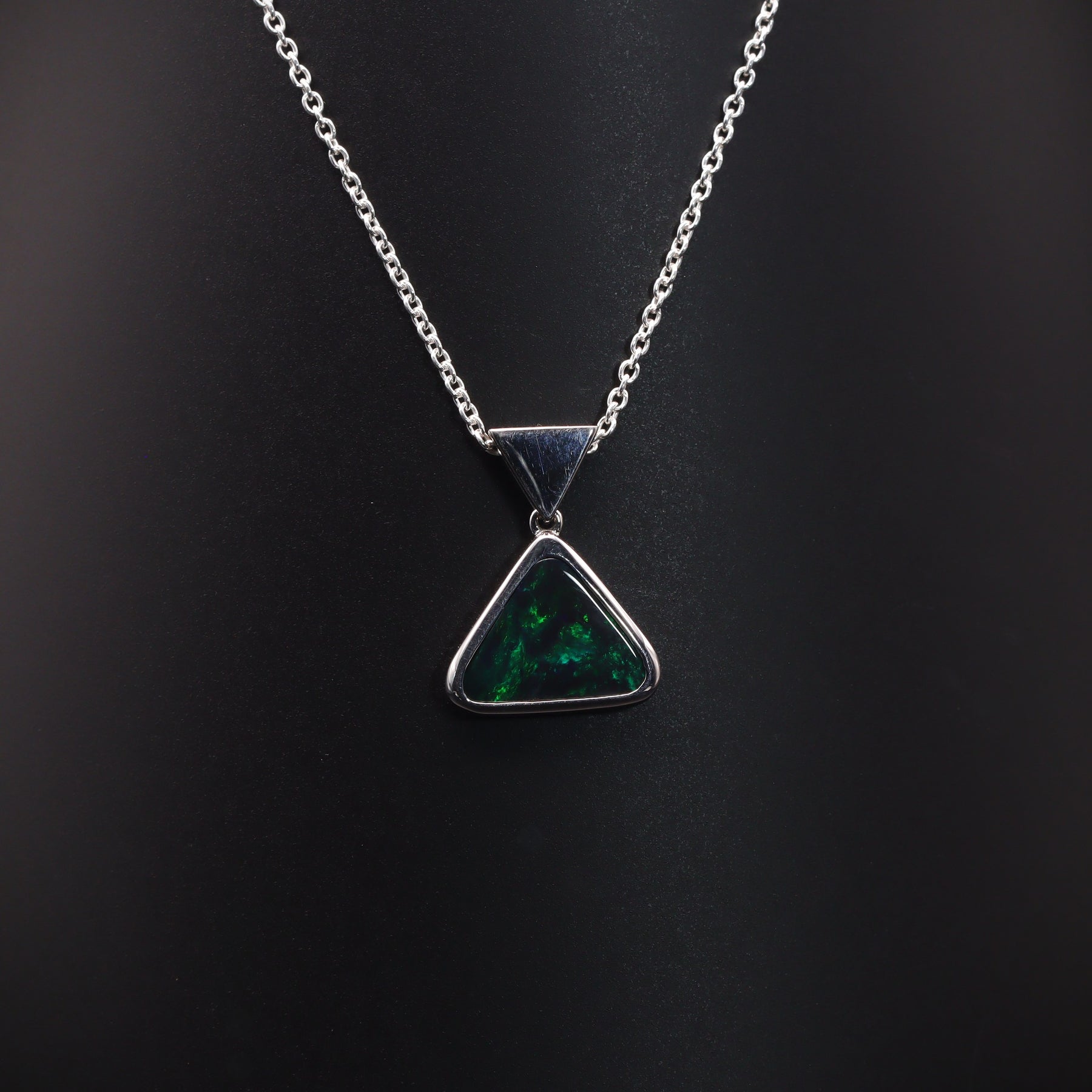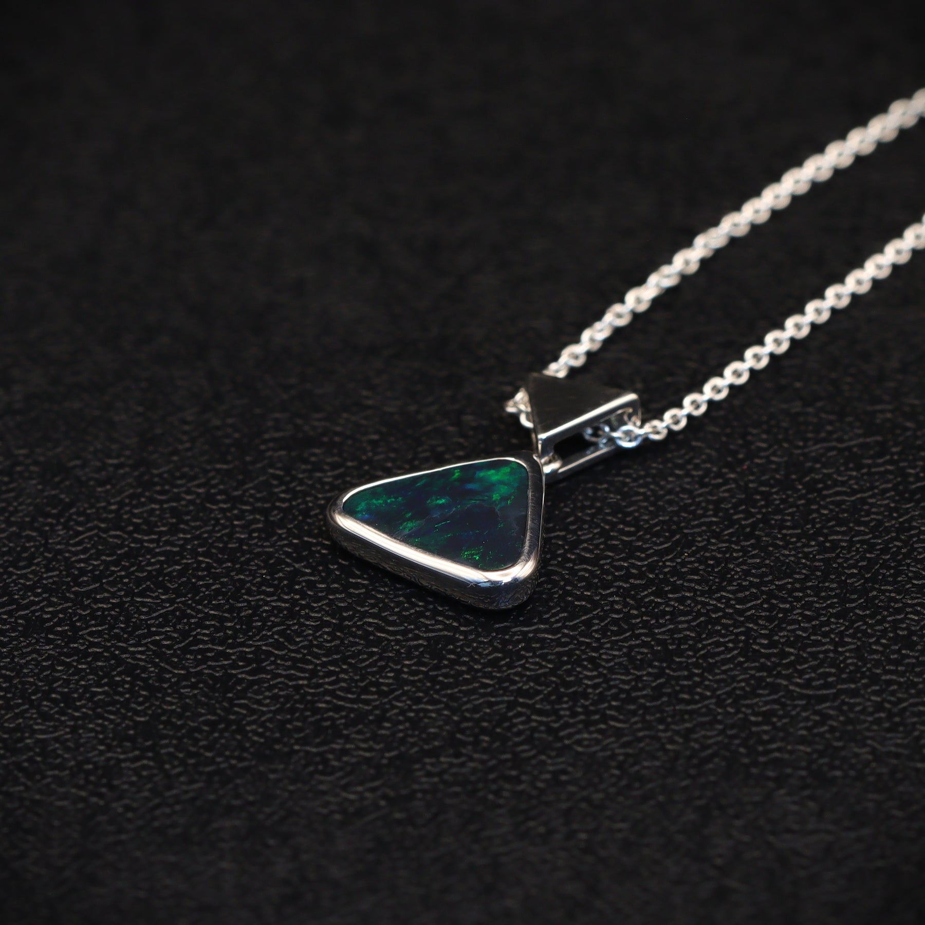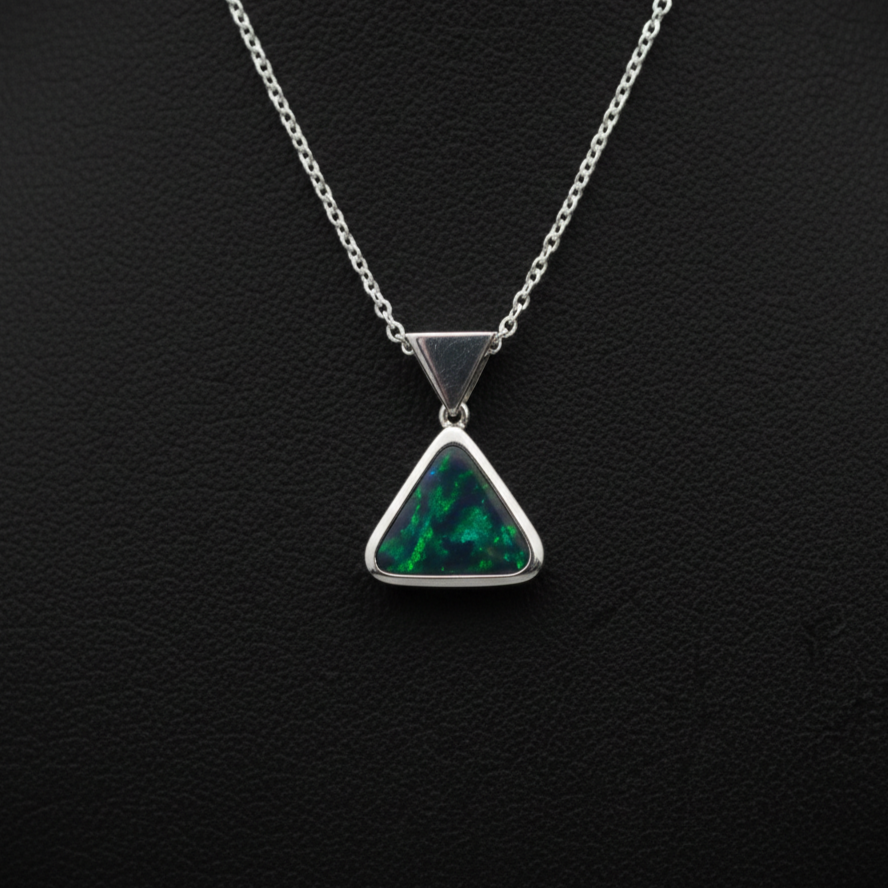 Make a statement with this solid black opal pendant. Showcasing vibrant green color and a rare triangular shape, it’s a standout piece you won’t want to miss.